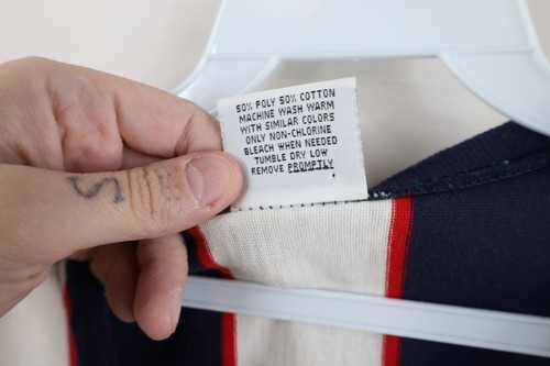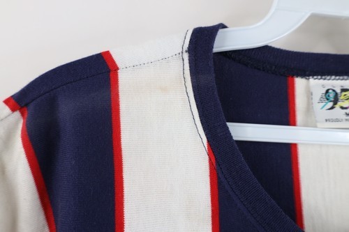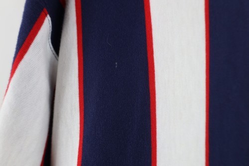 Blemishes front, back. Stains shoulders/arms. Collar, arms/shoulders discolored. Color faded. Pilling. Made in USA
