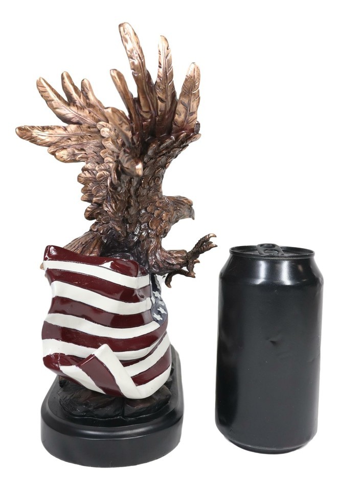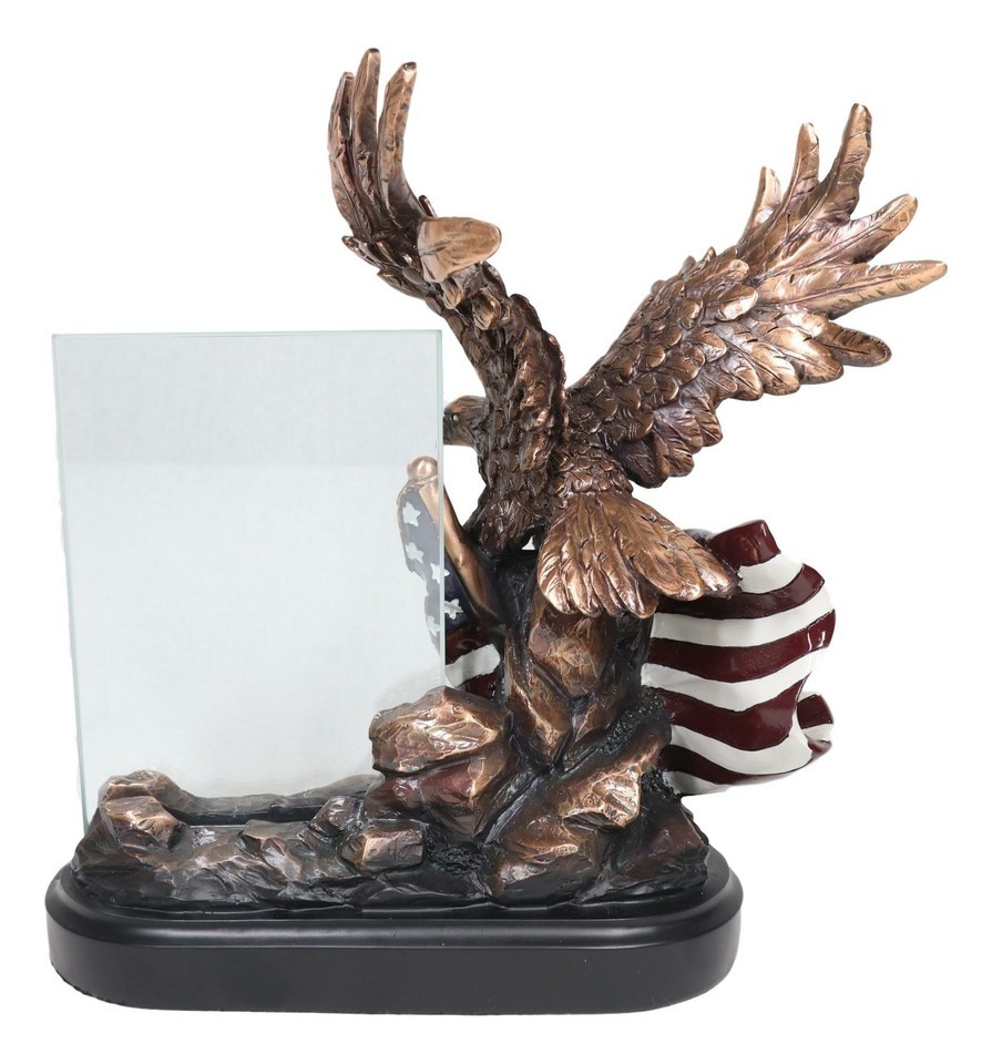 ? This Beautiful Bald Eagle On American Flag Picture Frame Statue is made of the highest quality resin, undergoing the process of bronze electroplating giving it a uniform shine on the inside as well as the surface of the figurine. This process makes the figurine resemble the look of actual bronze but with much lesser weight.This figurine is designed with a matching base to beautifully decorate your office, home and space.
