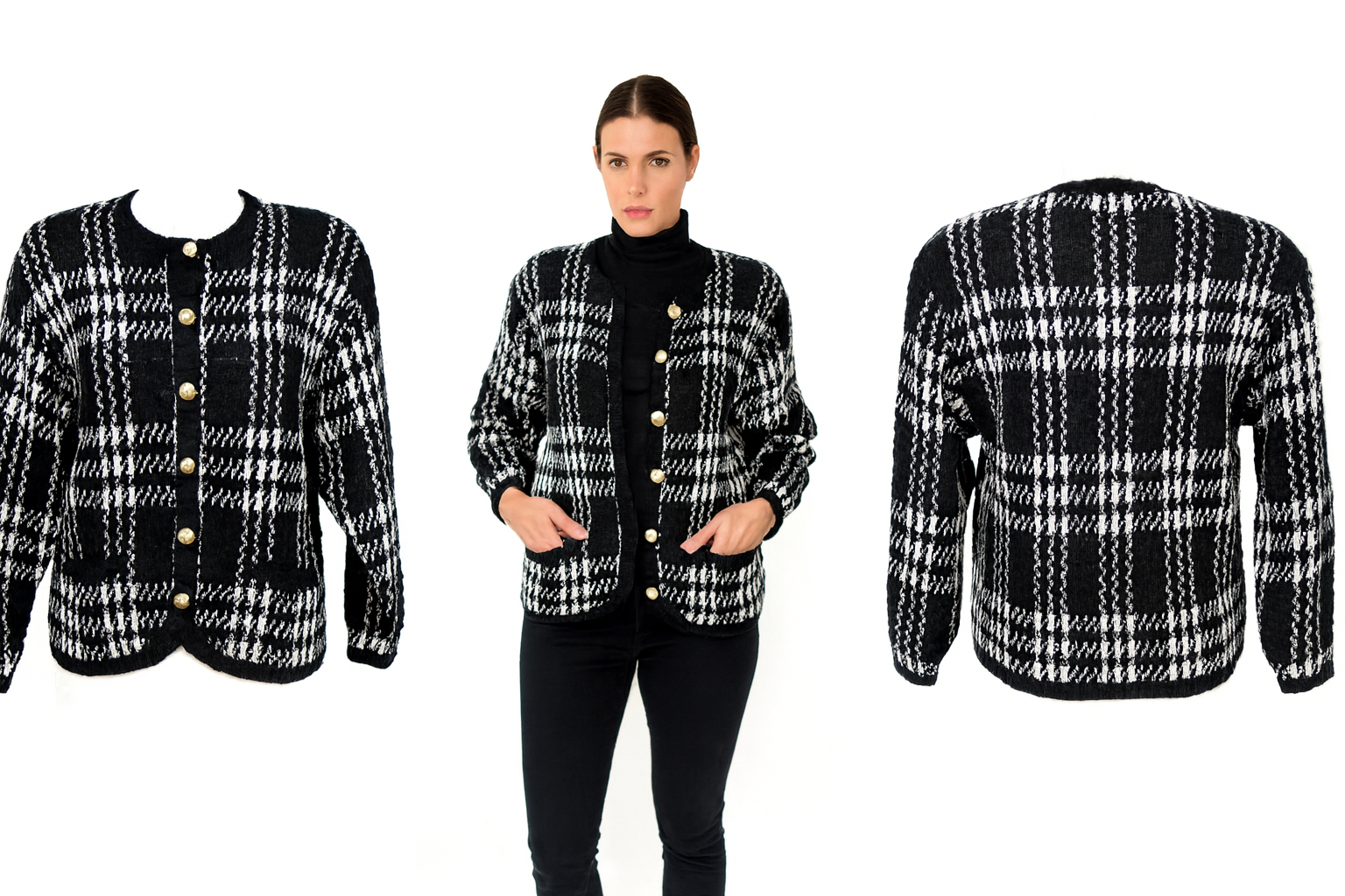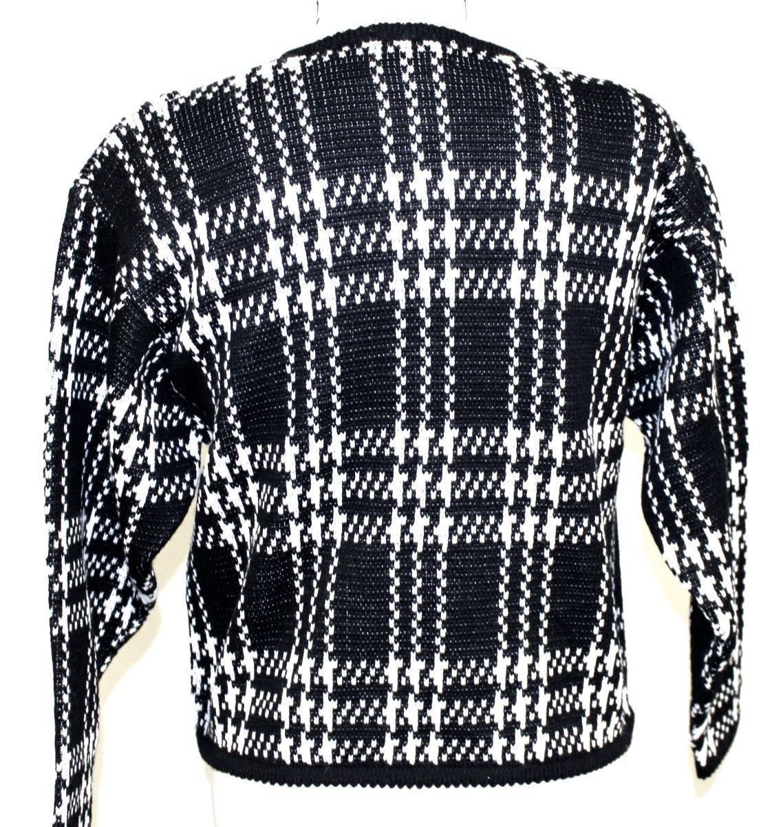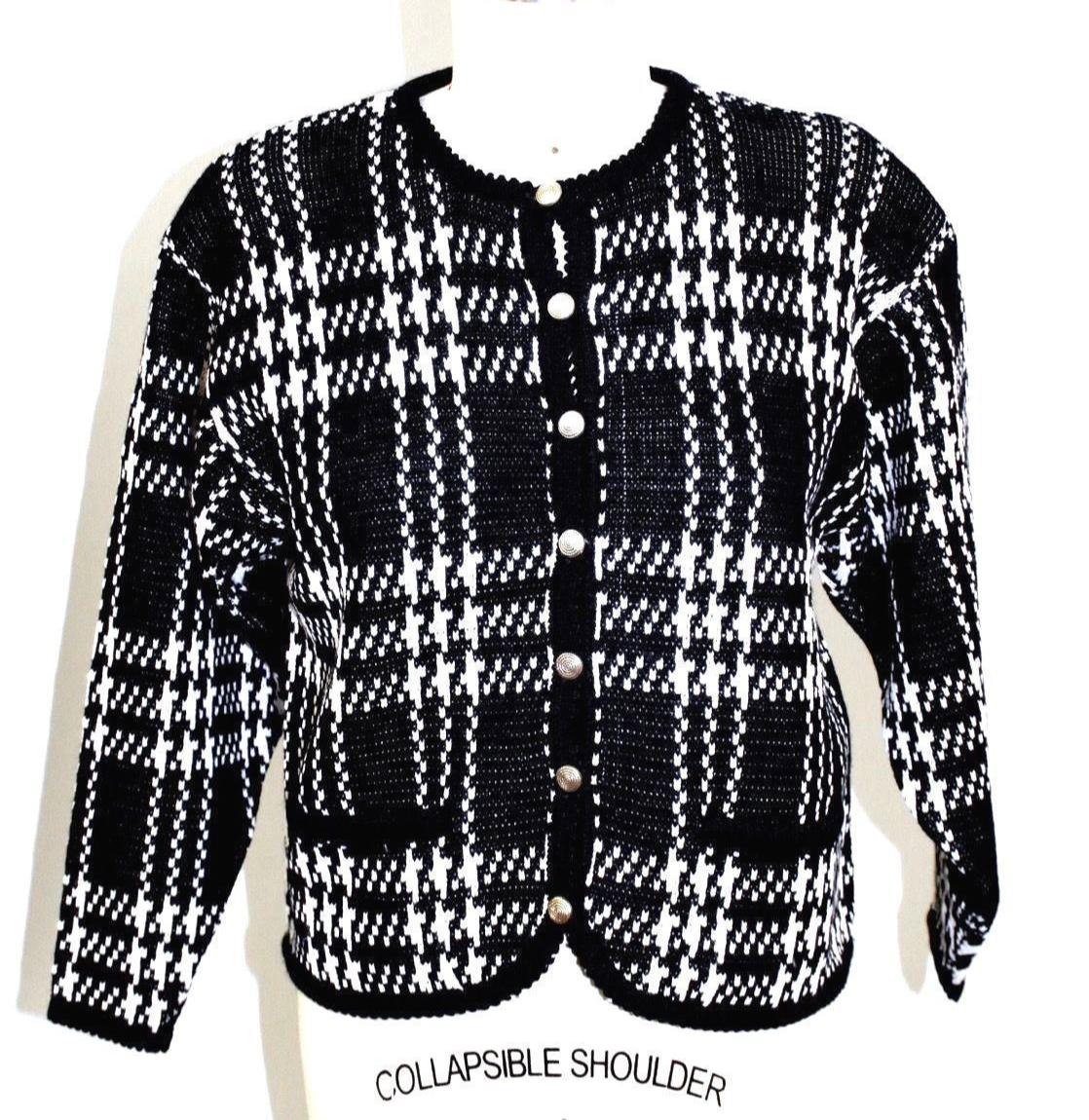 NWOT vintage Tally-Ho Pollak cardigan sweater in bold black white plaid. Features gold statement buttons, lightly padded shoulders for structure, and sweet front pockets. 100% acrylic. Never worn, excellent unused condition.