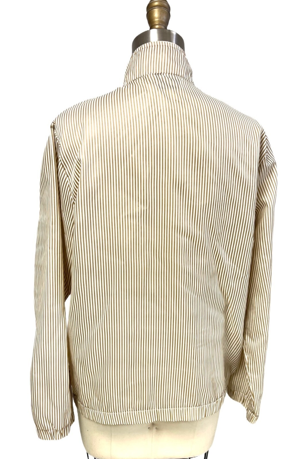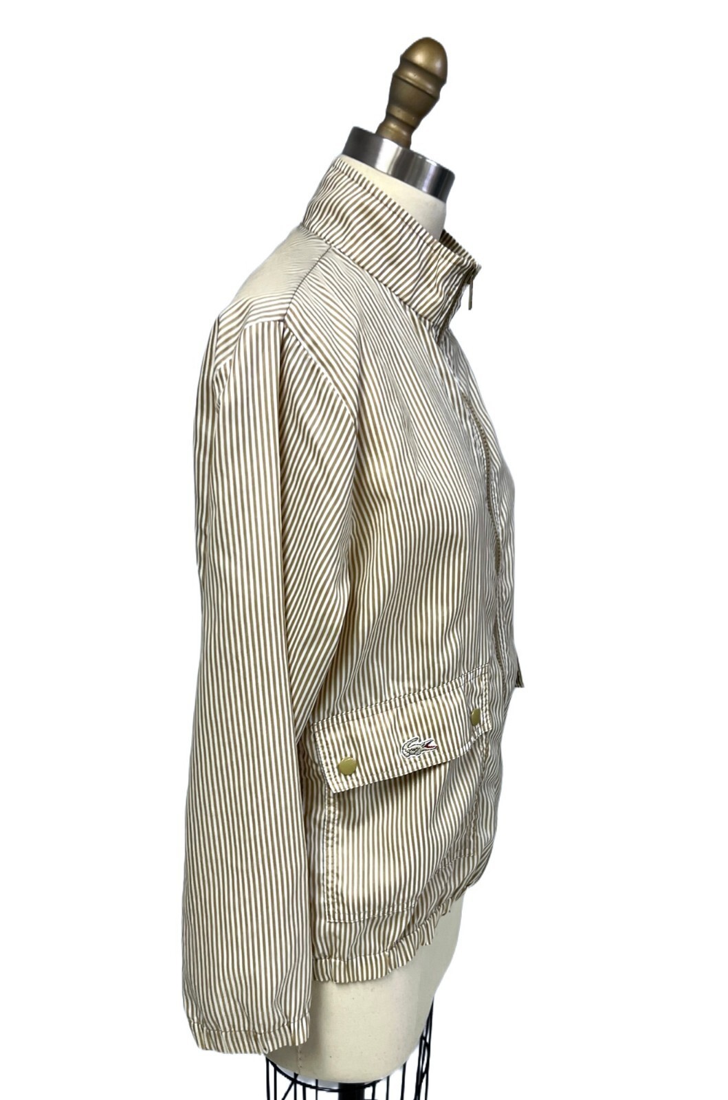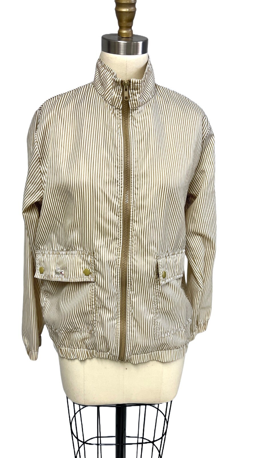 Vintage IZOD LACOSTE Gold and white striped NYLON GOLF WINDBREAKER JACKET with Beige ALLIGATOR , putting it as vintage 1970s, marked Small.