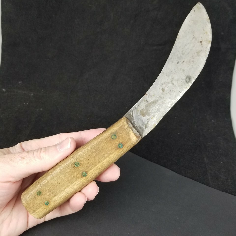 antique primitive Butcher Knife skinner Vintage Carbon Steel copper pins wood