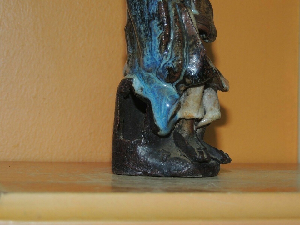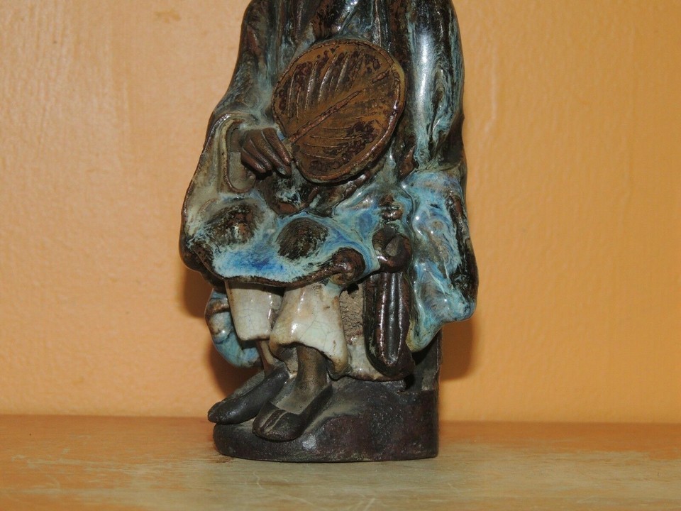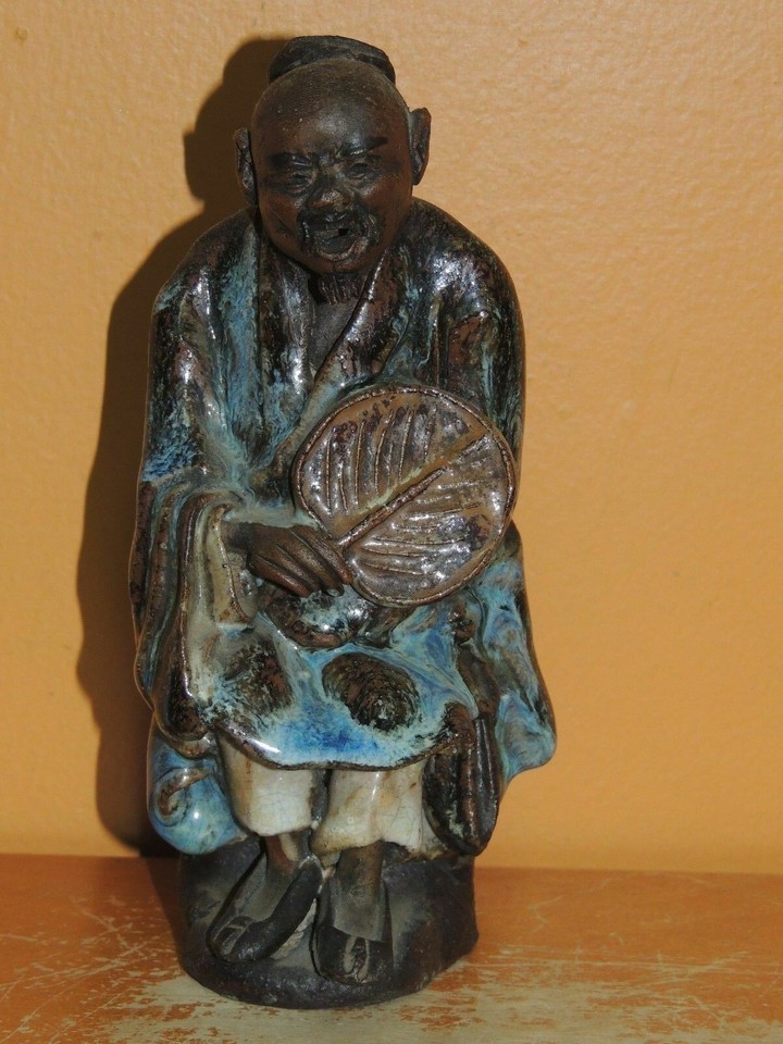 Chinese Mud Man/ Men Blue Robe w fan 5.75" drip glaze Mudman Antique unmarked