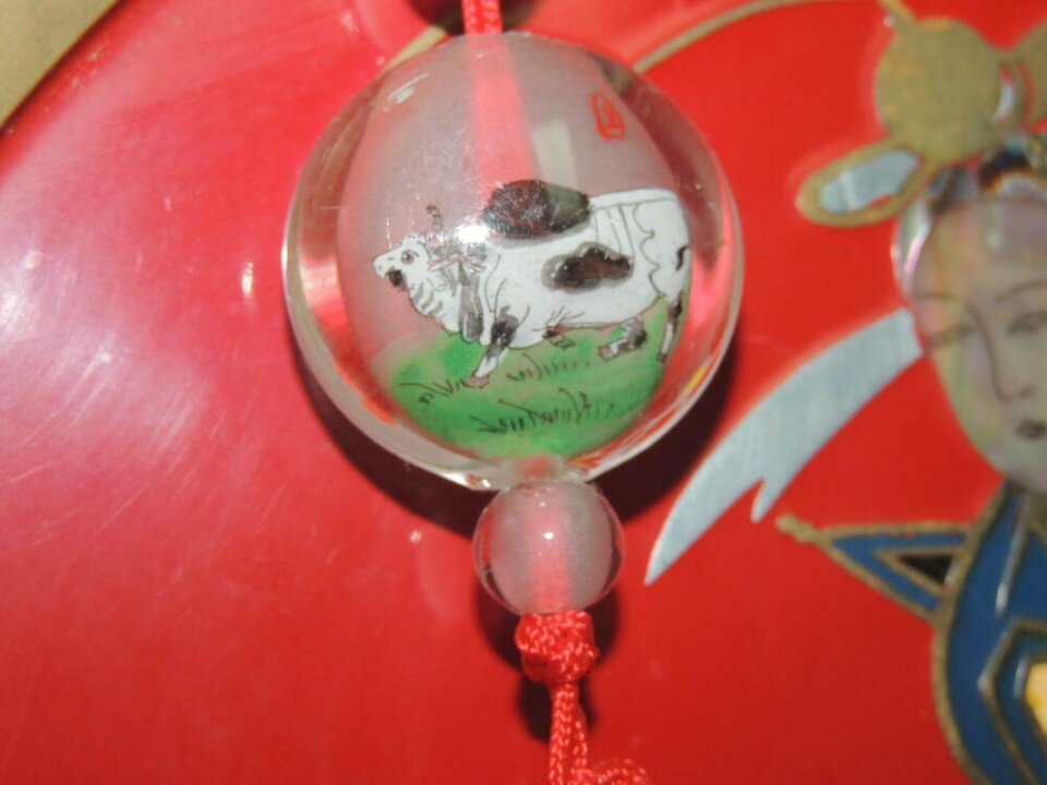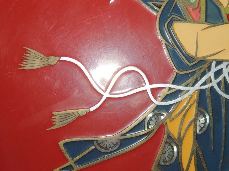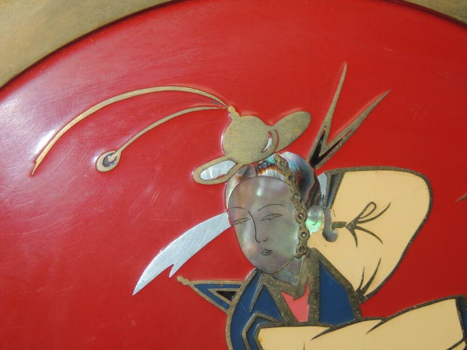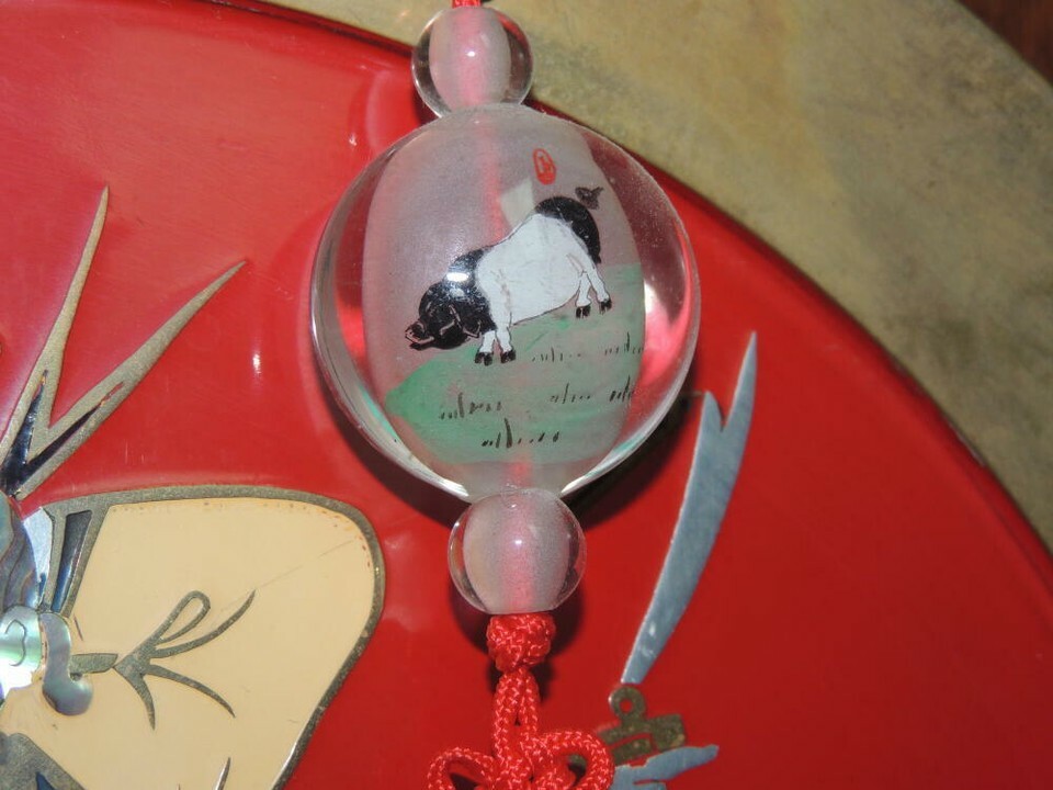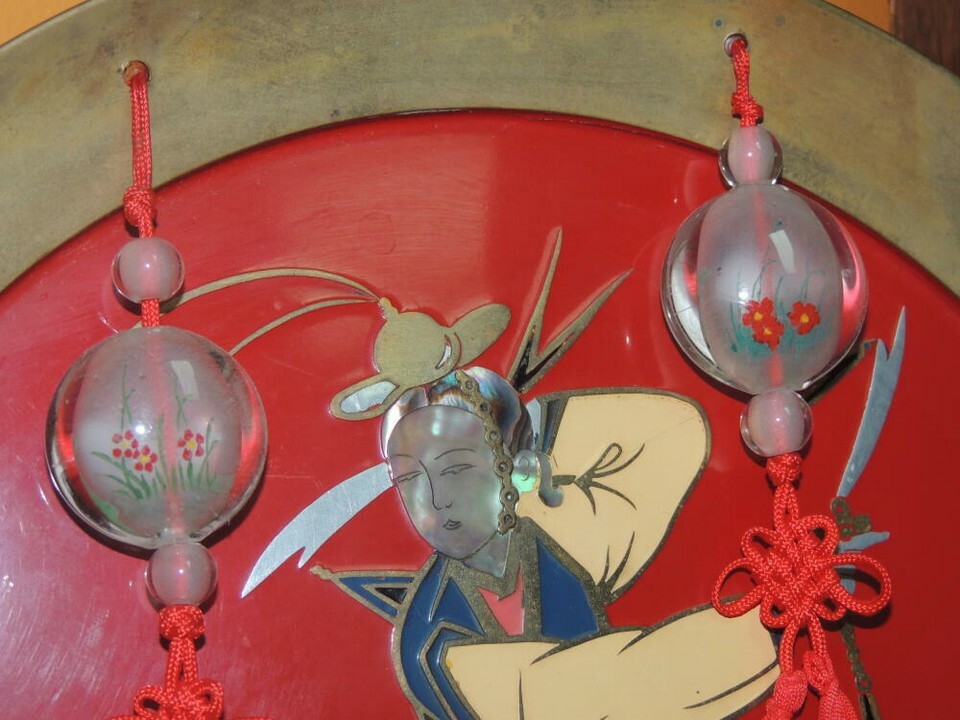 Chinese Brass Wall Hanging 11.5" enamel mop mother of pearl reverse painted bead
