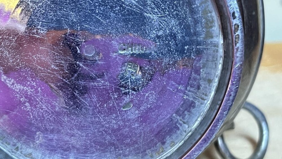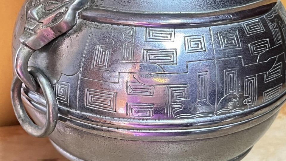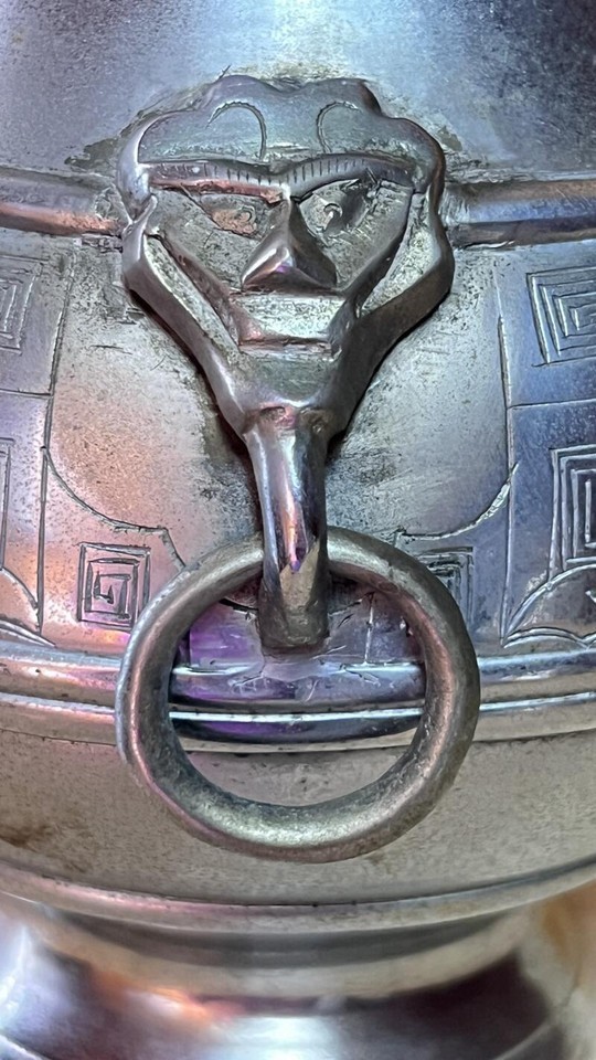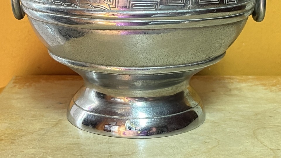 Heavy Vase brass / bronze w/ Silverplate 8" Chinese Porcelain c1910 deco handles