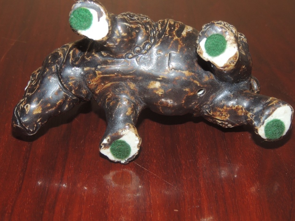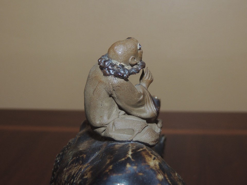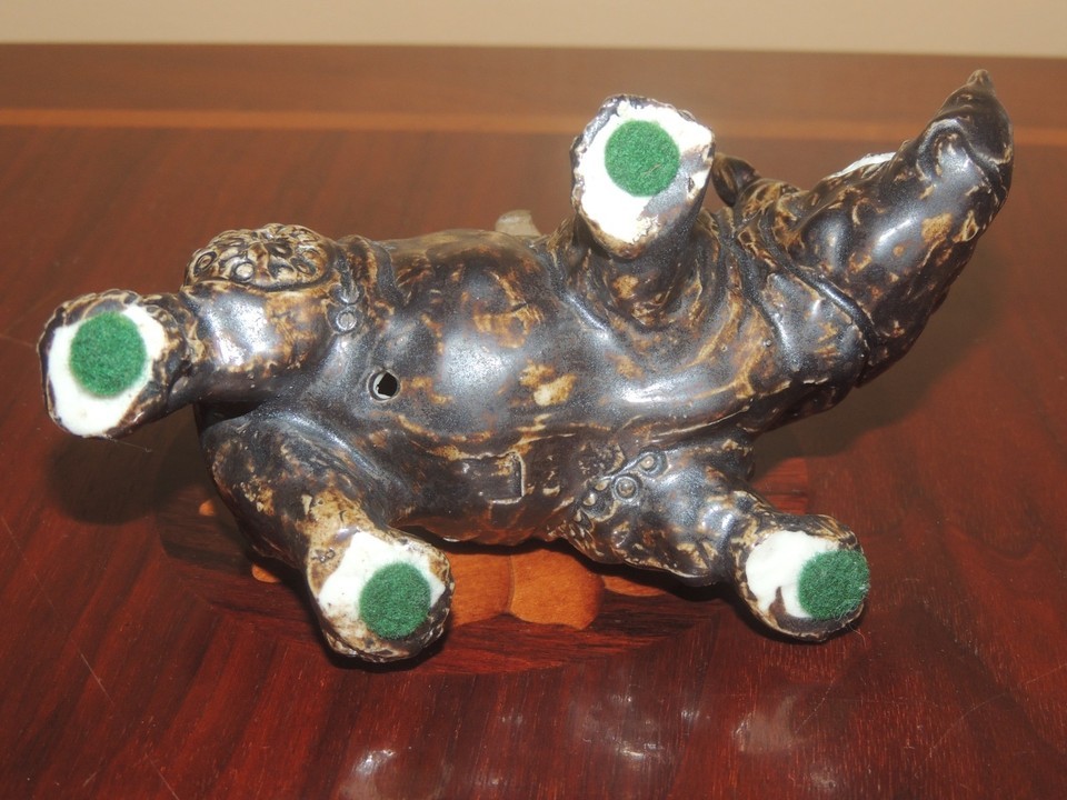 MUDMAN RIDING A RHINOCEROS. THERE IS A SMALL SQUARE IMPRESSION ON THE UNDERSIDE THAT MAY HAVE BEEN A MAKERS MARK, BUT IT IS NOT CLEAR. I AM NOT AN ANTIQUITIES EXPERT - PLEASE LOOK AT THE PICTURES CAREFULLY.