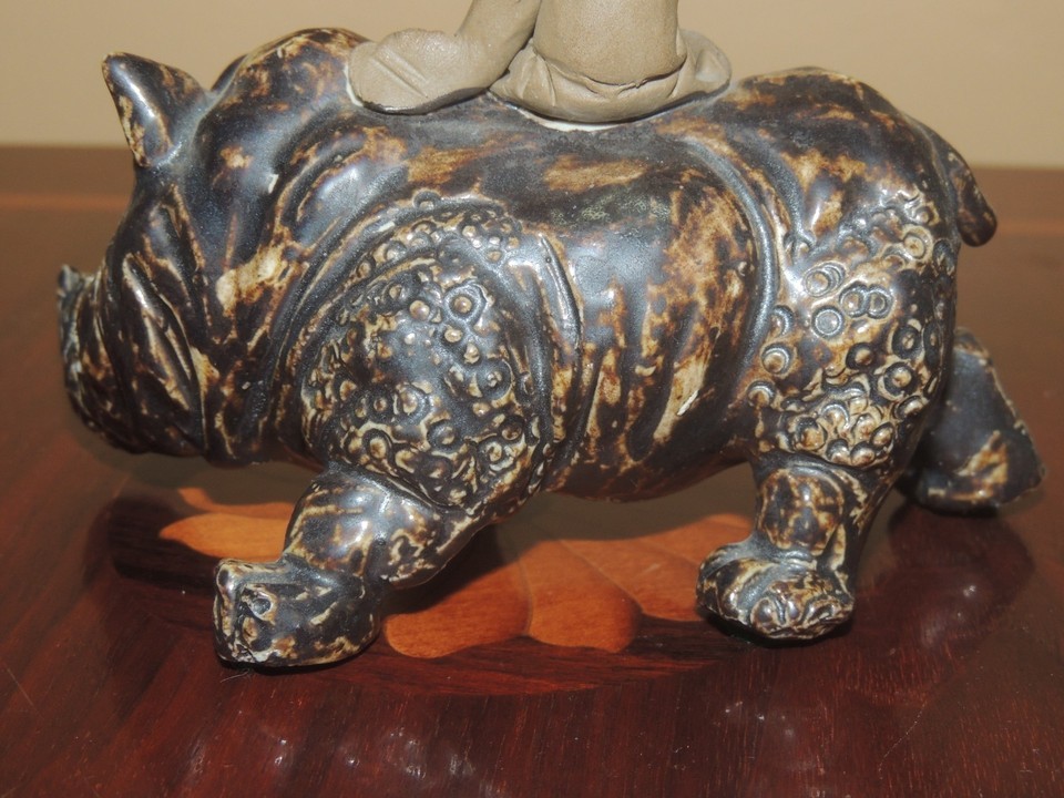 Rare Mudman riding Porcelain Rhino Rhinoceros 4"x5.5" Mud Man Chinese Vintage