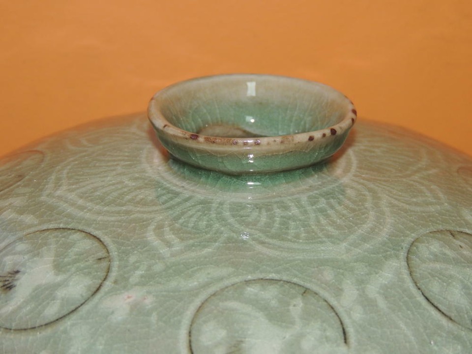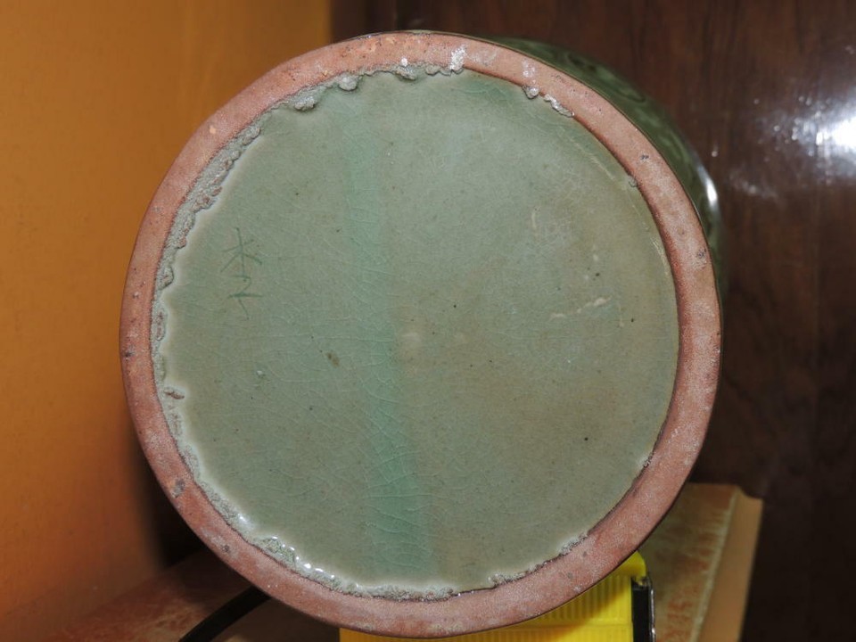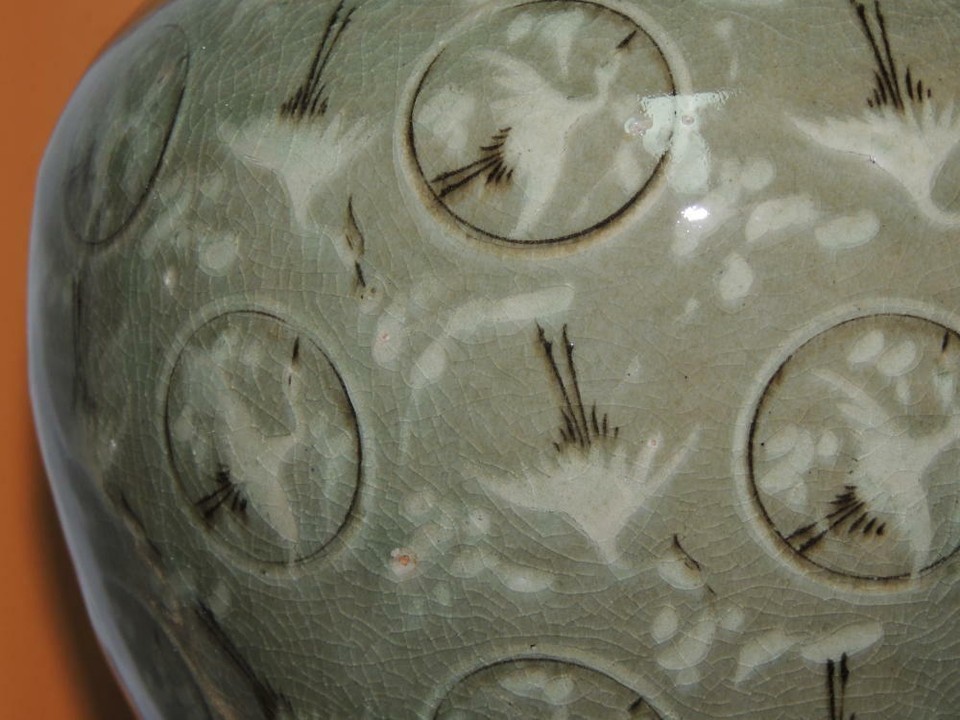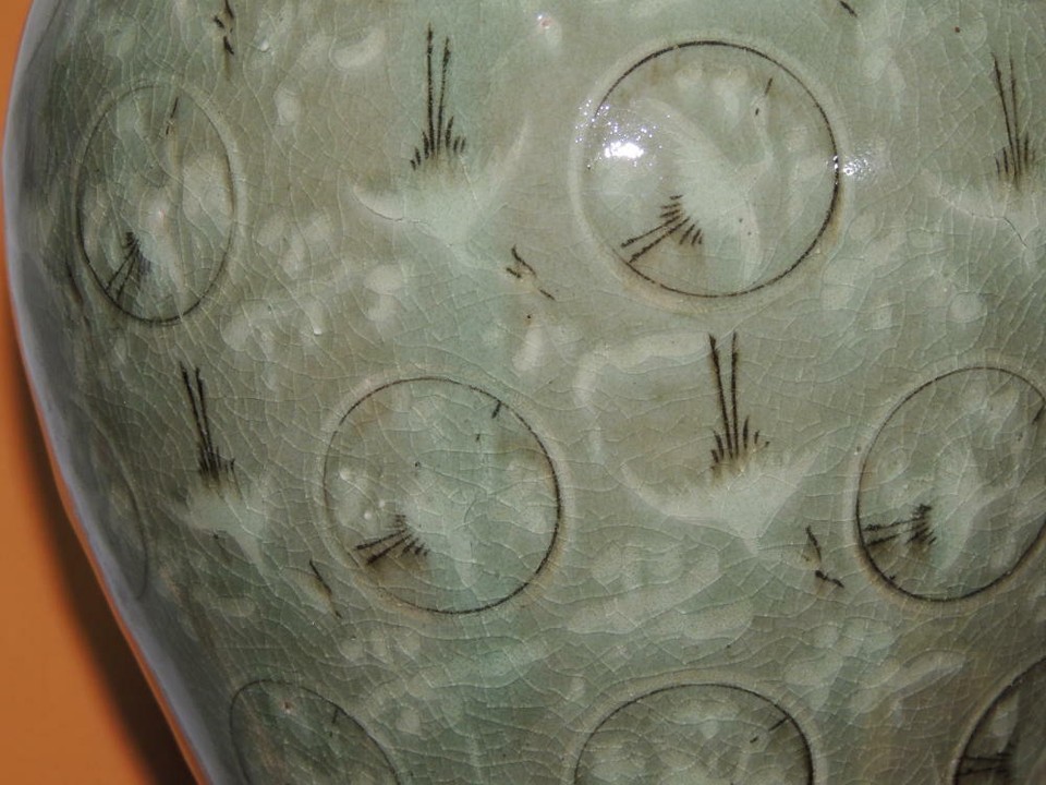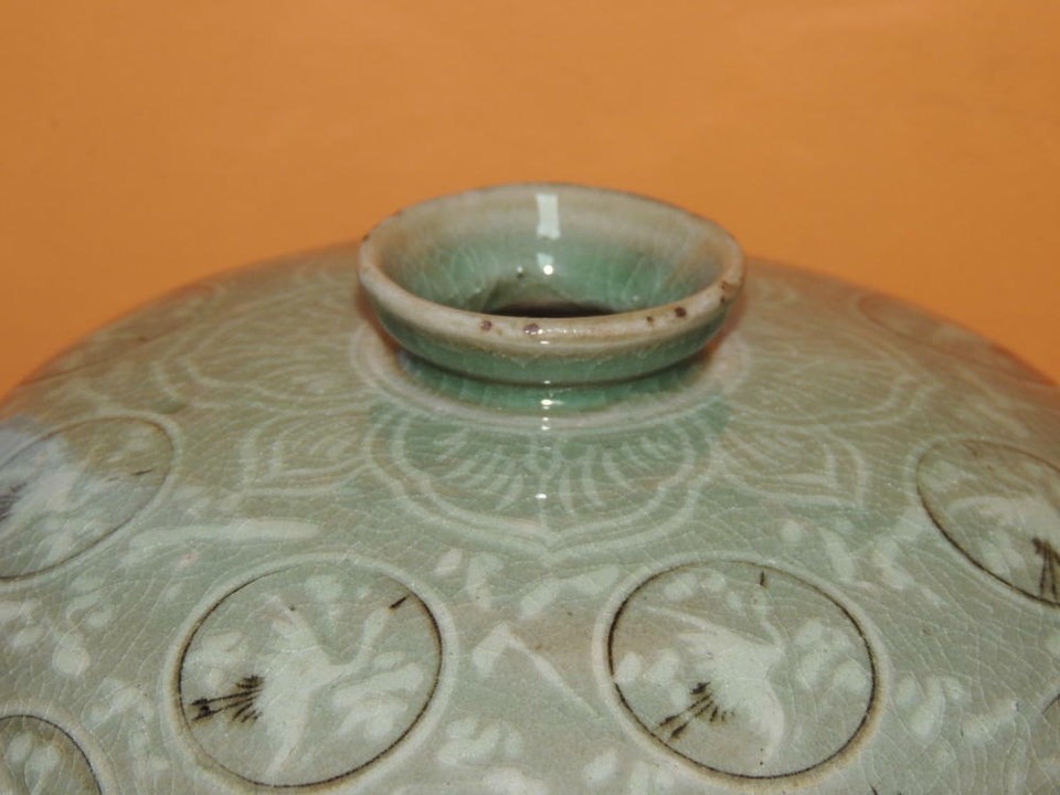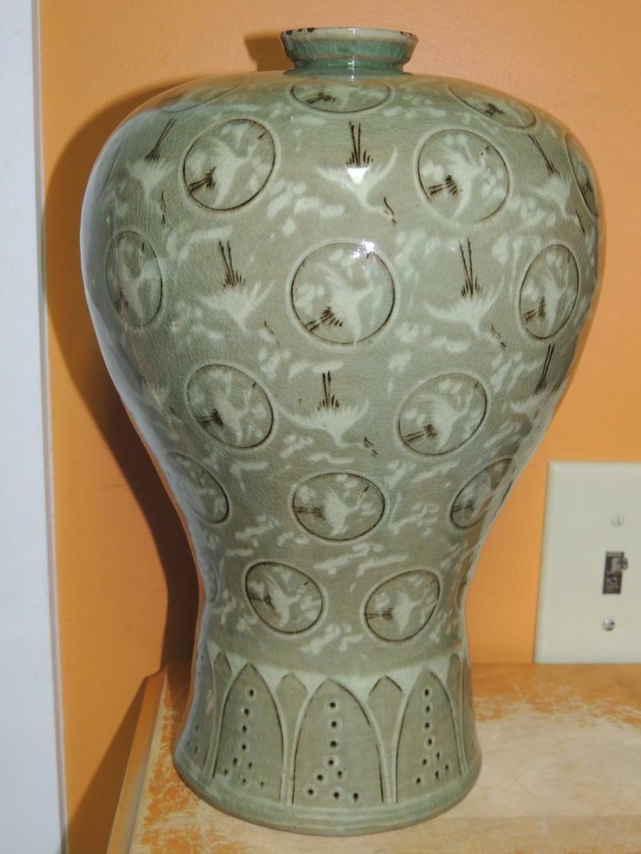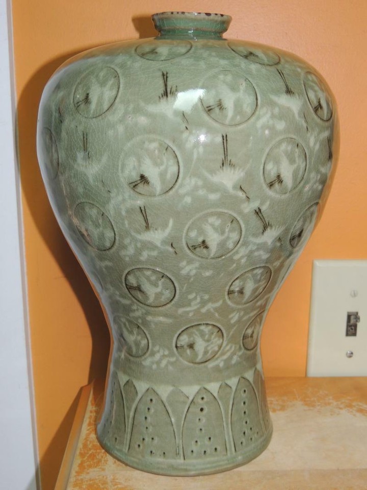 Celadon Meiping Vase 12"+ crane pattern marked Li Chinese / Korean