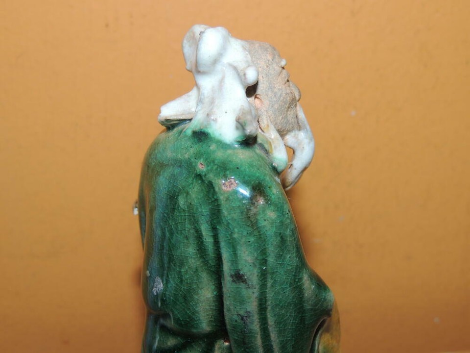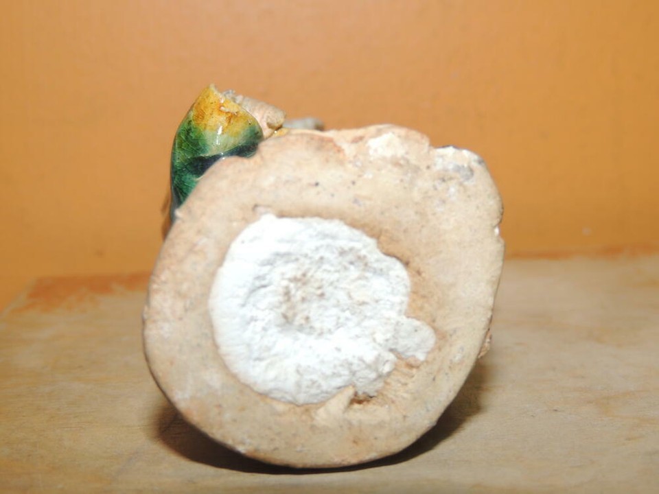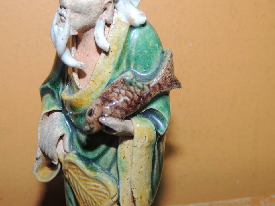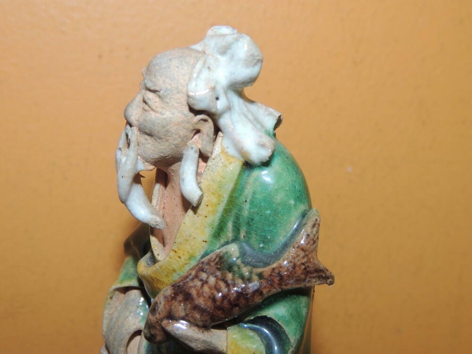 Chinese Mud Man Men 4.25"+ Green & Yellow glaze fish Mudman Antique China c1910