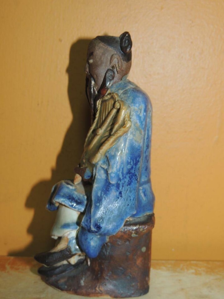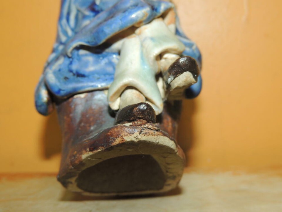 Chinese Mud Man/ Men Blue Robe fan 5.75" drip glaze marked CHINA Mudman Antique