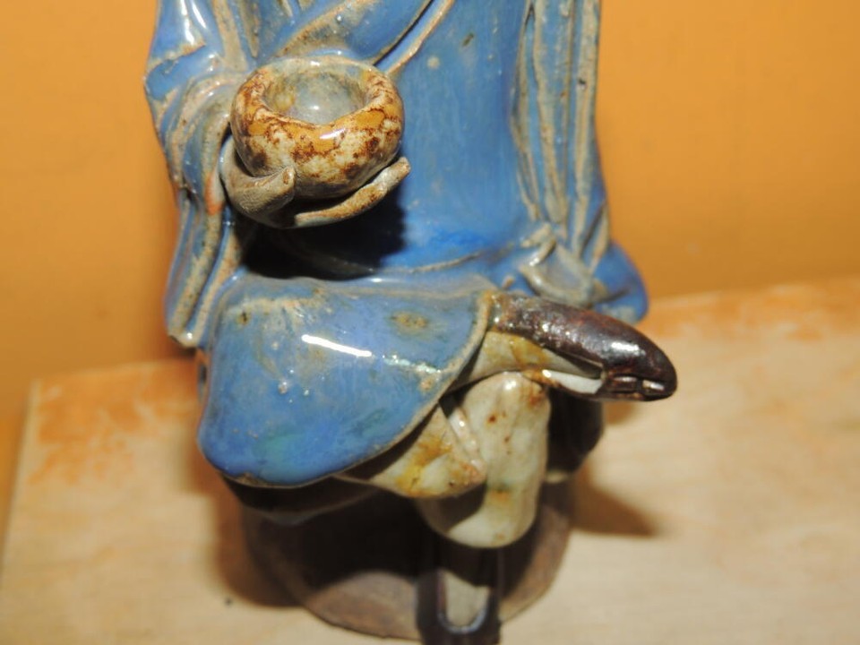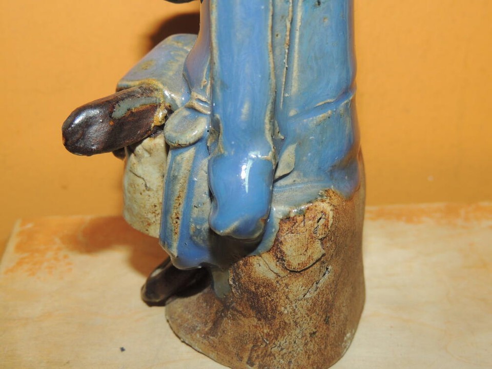 Chinese Mud Man/ Men Blue Robe bowl 5.75" thin drip glaze Mudman damaged marked
