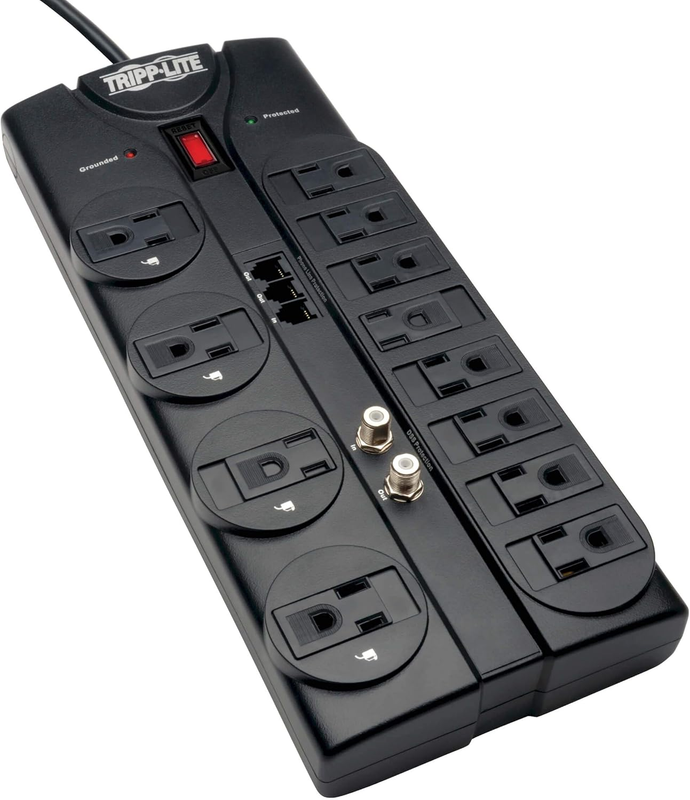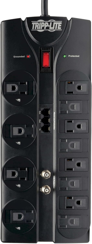 Tripp Lite's 12-Outlet Surge Protector offers economical AC surge suppression for protection of workstations, PCs, telecom systems, Home electronics and other sensitive equipment. The TLP1208TLTV features 12 outlets, an 8 ft. cord with a space-saving right-angle plug, and diagnostic LEDs to warn of suppressor damage. The unit has a surge suppression rating of 2,880 Joules to shield equipment from line noise and the strongest surges.