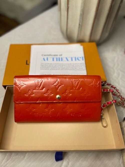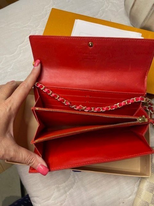 Luxurious and versatile, this Louis Vuitton Vernis Sarah Long Wallet in glossy red patent leather is a timeless classic. The Vernis line is celebrated for its high-shine finish and bold elegance, while the Sarah style offers exceptional functionality with multiple card slots, a zippered coin pocket, and roomy compartments for bills and receipts. This piece features gold-tone hardware and comes with an unbranded matching chain, making it easy to wear as a wallet-on-chain for hands-free convenience.