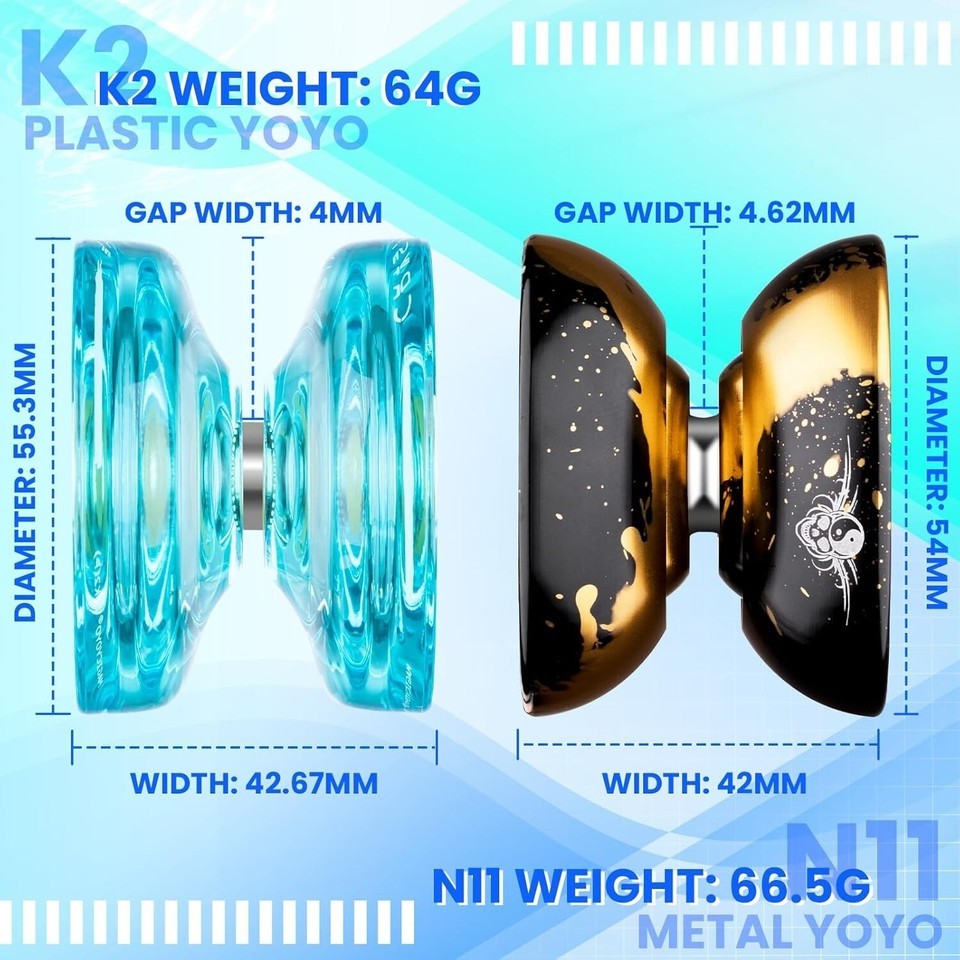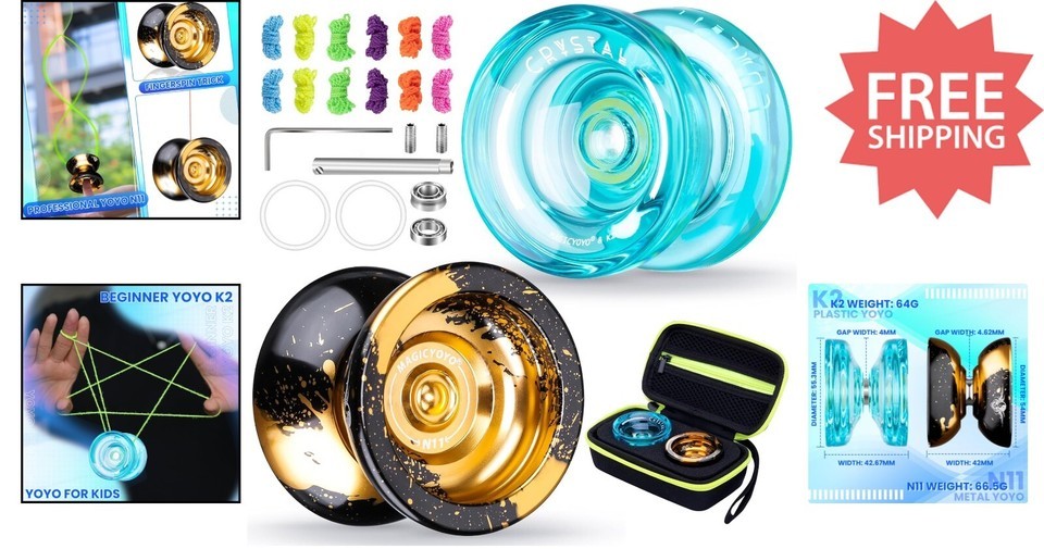 Discover endless fun and learning with our yoyo pack, perfect for all skill levels. This complete set includes two versatile yoyos?the unresponsive Yoyo N11 for advanced tricks and the responsive Yoyo K2 for beginners?along with a stylish storage case, 12 extra strings, and a bearing kit. Crafted from high-quality materials like alloy aluminum and durable plastic, these yoyos are built to last. Whether gifting for birthdays, holidays, or special occasions, this set offers a perfect introduction to the exciting world of yoyoing. To ensure fast and reliable delivery, we work with multiple fulfillment partners and suppliers. Depending on availability and location, your order may ship from different warehouses or arrive in packaging that varies from item to item. Tracking details are typically provided shortly after shipment, and customer satisfaction remains our top priority.