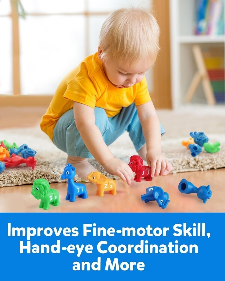 Features: Alphabet Learning,Matching Game,Fine Motor Skill Development,Color Recognition,Shape Recognition,Portable Draw-string Bag,Double-sided Letter Animals,Hands-on Skills,Color Sorting Skills