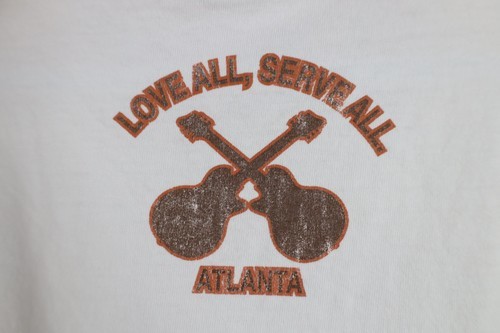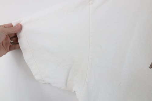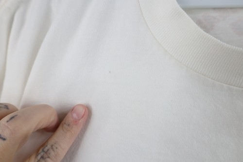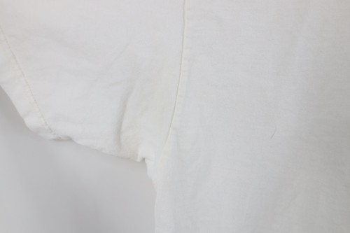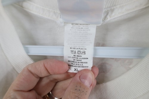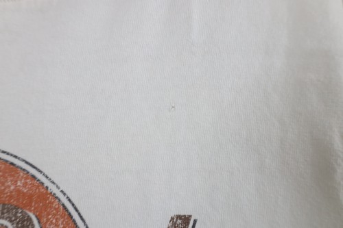 Holes front top. Collar stretched. Collar, arms discolored. Yellowed. Pilling. Graphics faded