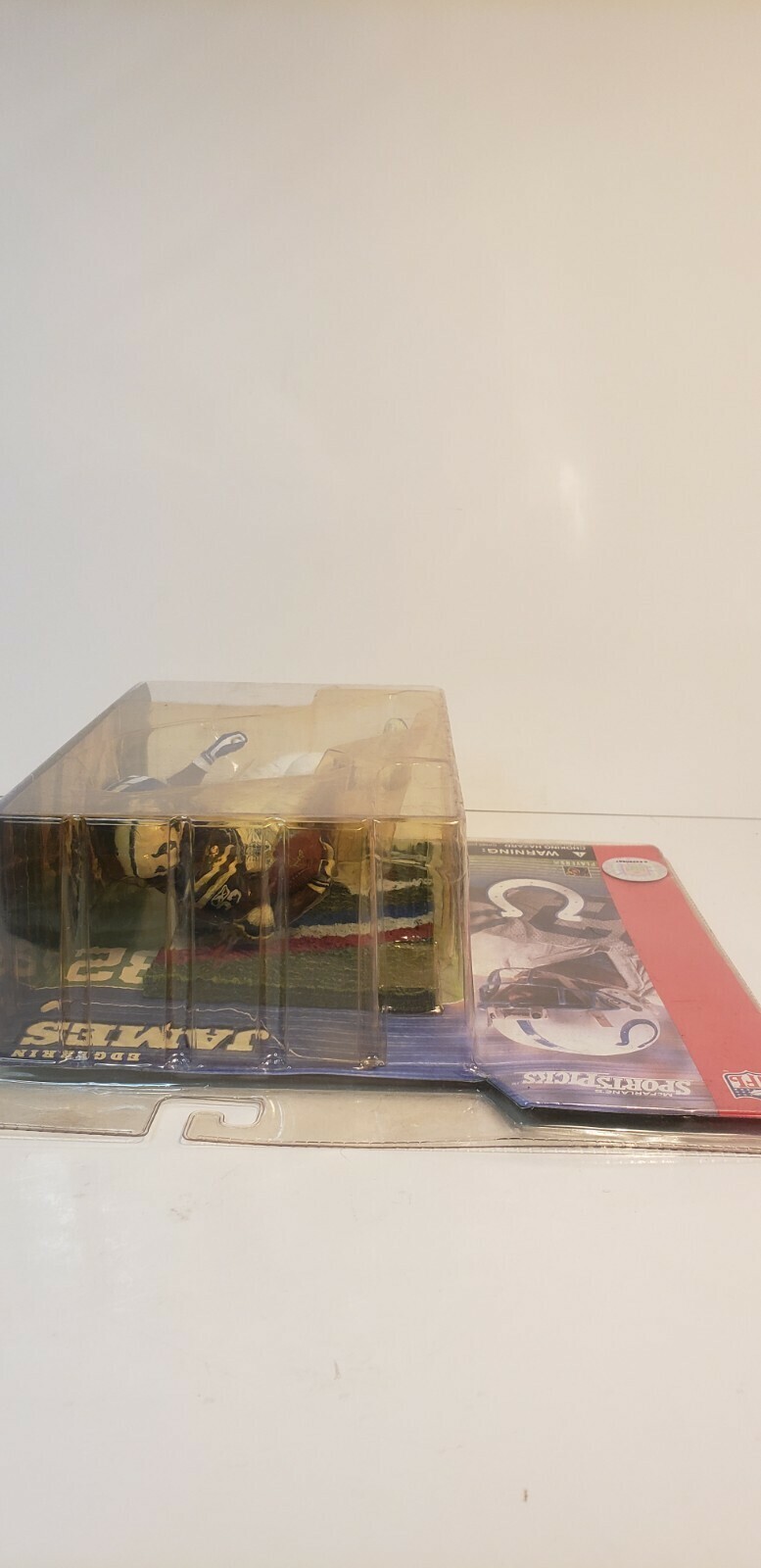 This New McFarlane Toys action figure features Edgerrin James, a former football player who played for the Indianapolis Colts is a HOF running back in the NFL. The figure is a rookie variant with a blue jersey and a custom base. It stands at 6-7 inches tall .