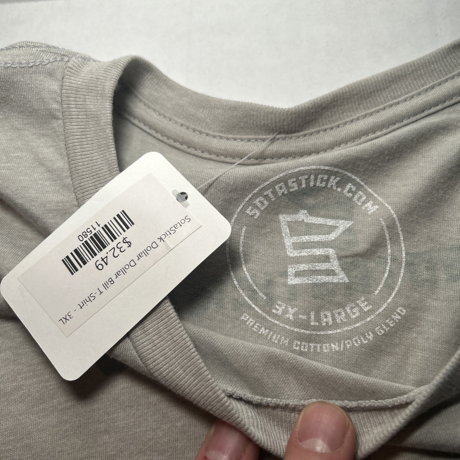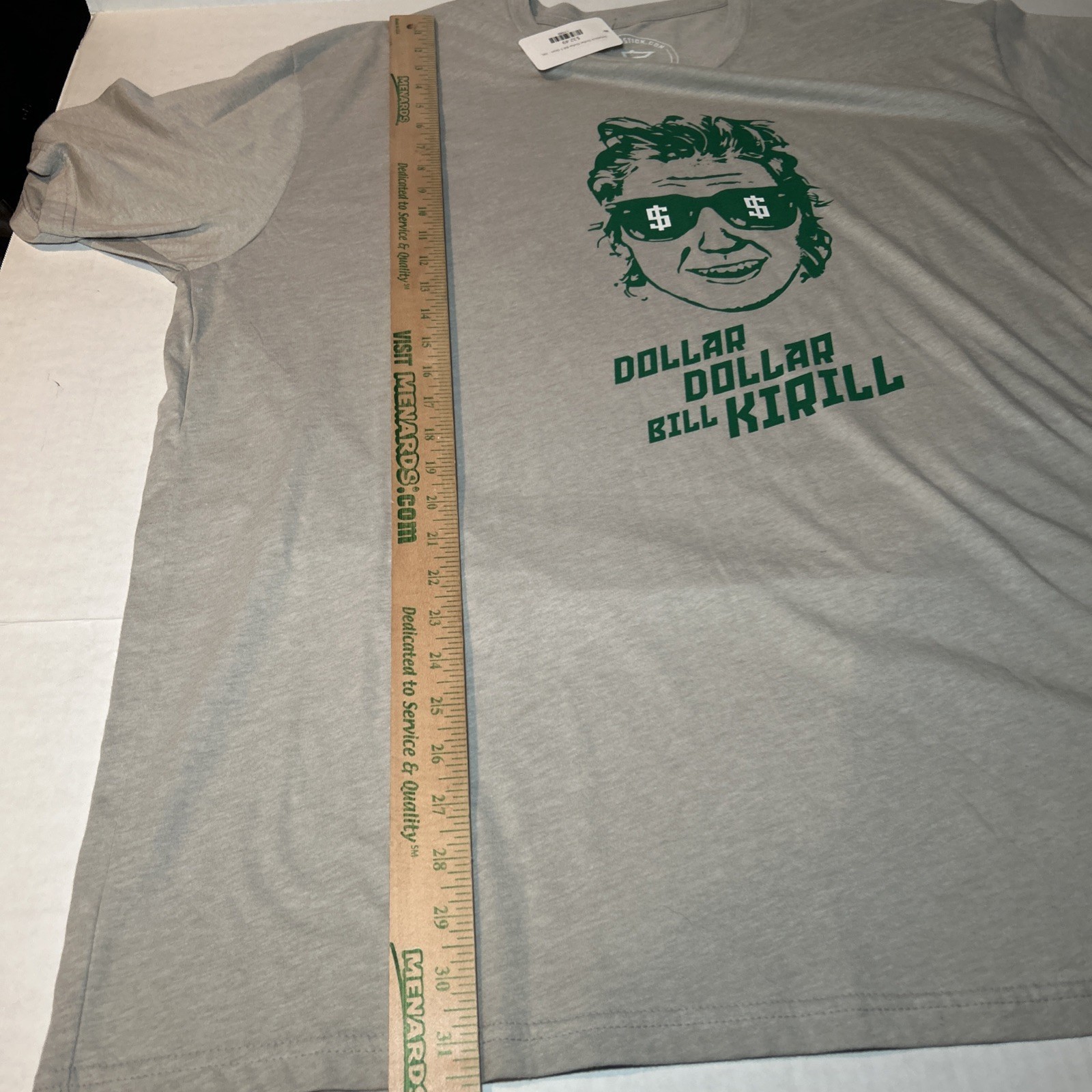 The product is a Sotastick brand T-shirt in size 3XL, designed for big and tall men. It features the Minnesota Wild star player "Dollar Dollar Bill Kirill" Kaprizov in a gray color. The shirt is sure to make a unique and funny statement with its unique design and large size. Perfect for those looking for a fun and quirky addition to their wardrobe.