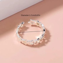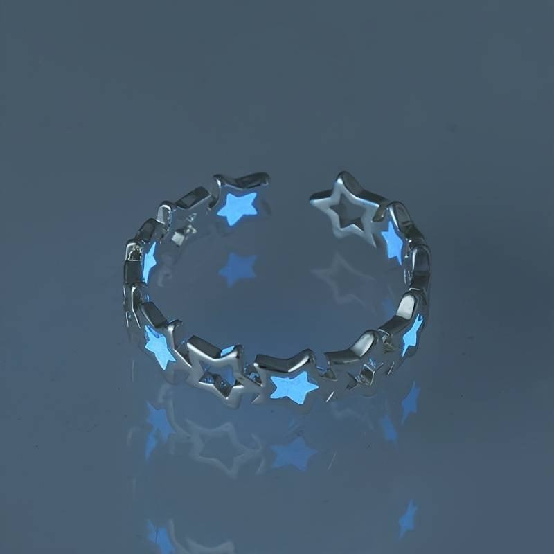 Shine bright day or night with this magical glow-in-the-dark star ring! Crafted with a silver-tone finish, this adjustable open band features a continuous row of star cutouts filled with luminous material that charges in the light and glows in the dark. With a 1.7 cm (0.67 inch) diameter and a flexible fit, this celestial accessory is perfect for any finger size. Whether you're a stargazer, a fan of dainty aesthetic jewelry, or looking for a unique gift, this ring adds a dreamy sparkle to any look.