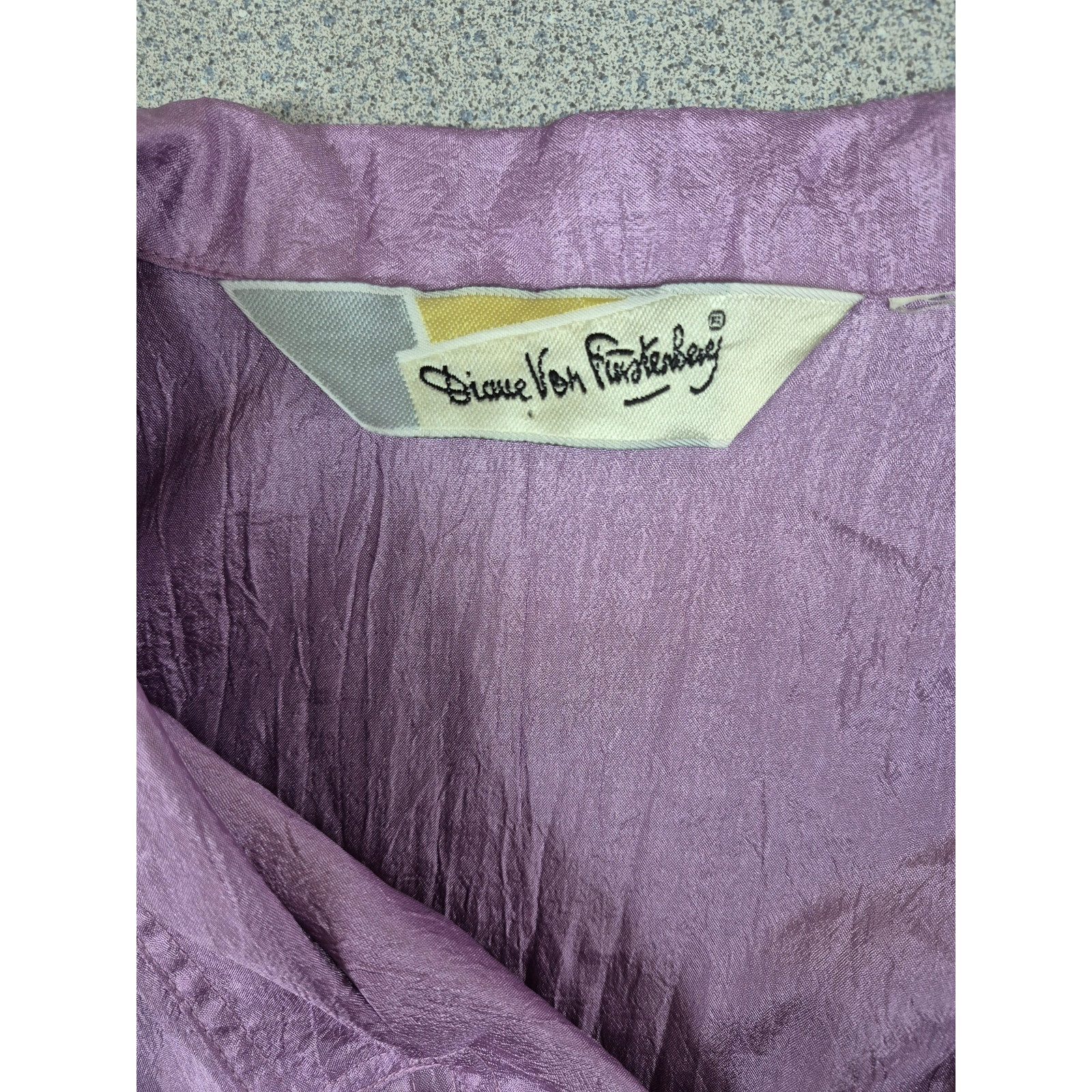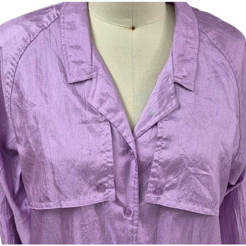 Vtg 80s 90s Diane Von Furstenberg Lilac Purple Crinkle Tab SLeeve Shirt Blouse L- no material tag but feels like easy care polyester. In excellent clean condition.
