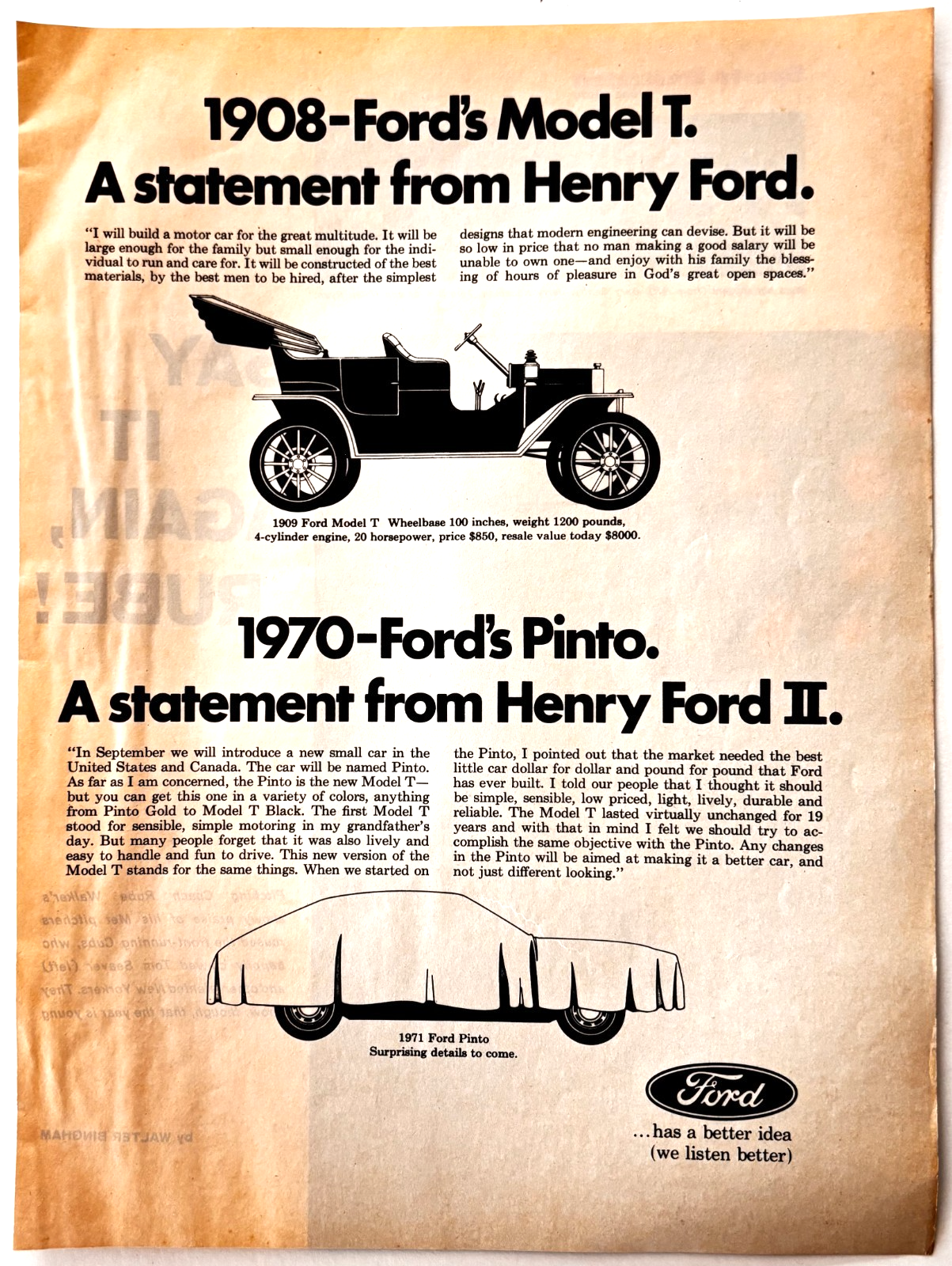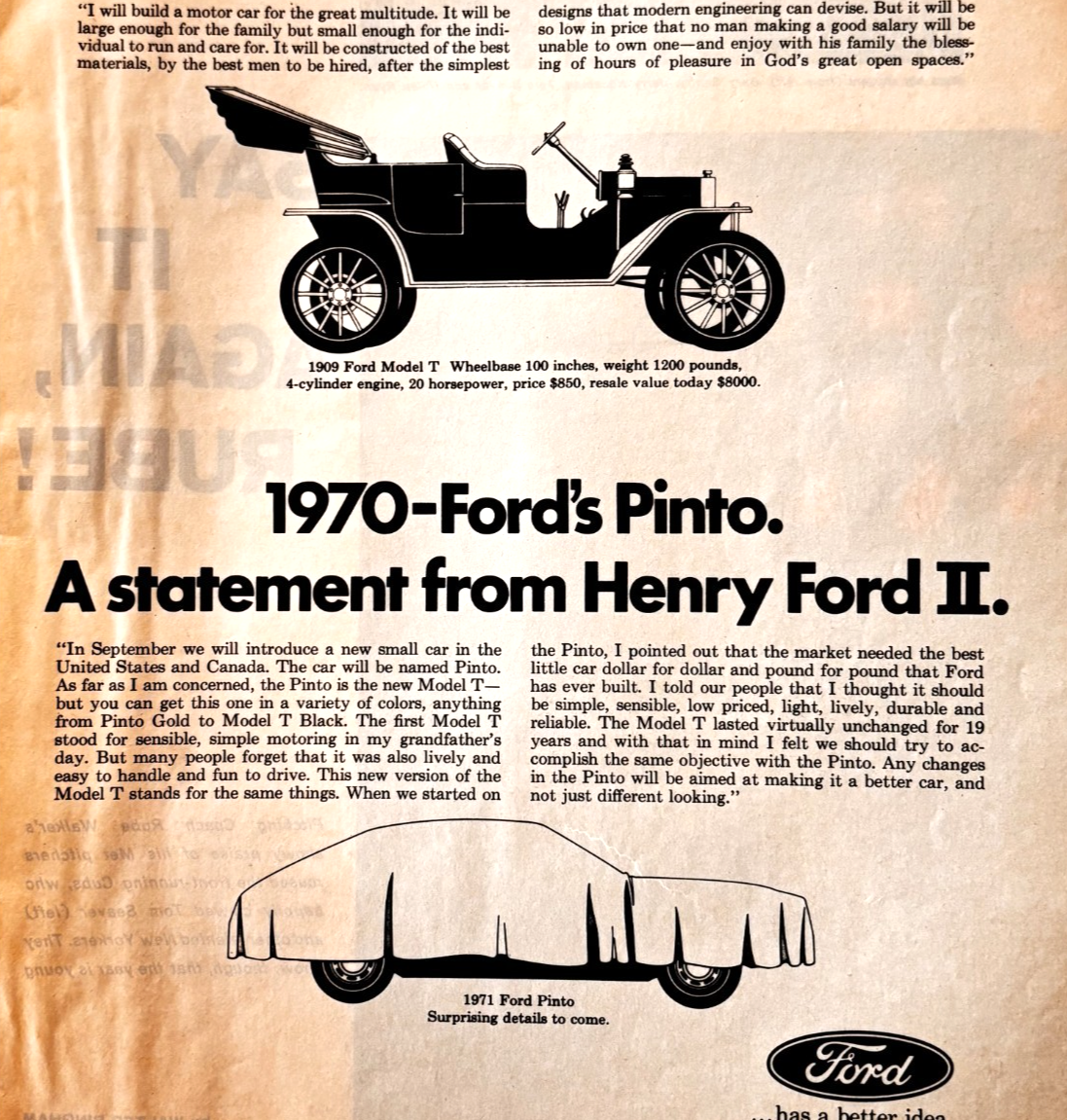 1970 Ford Pinto Advertisement Vintage Automobilia Model T 1908 Classic Car F15O