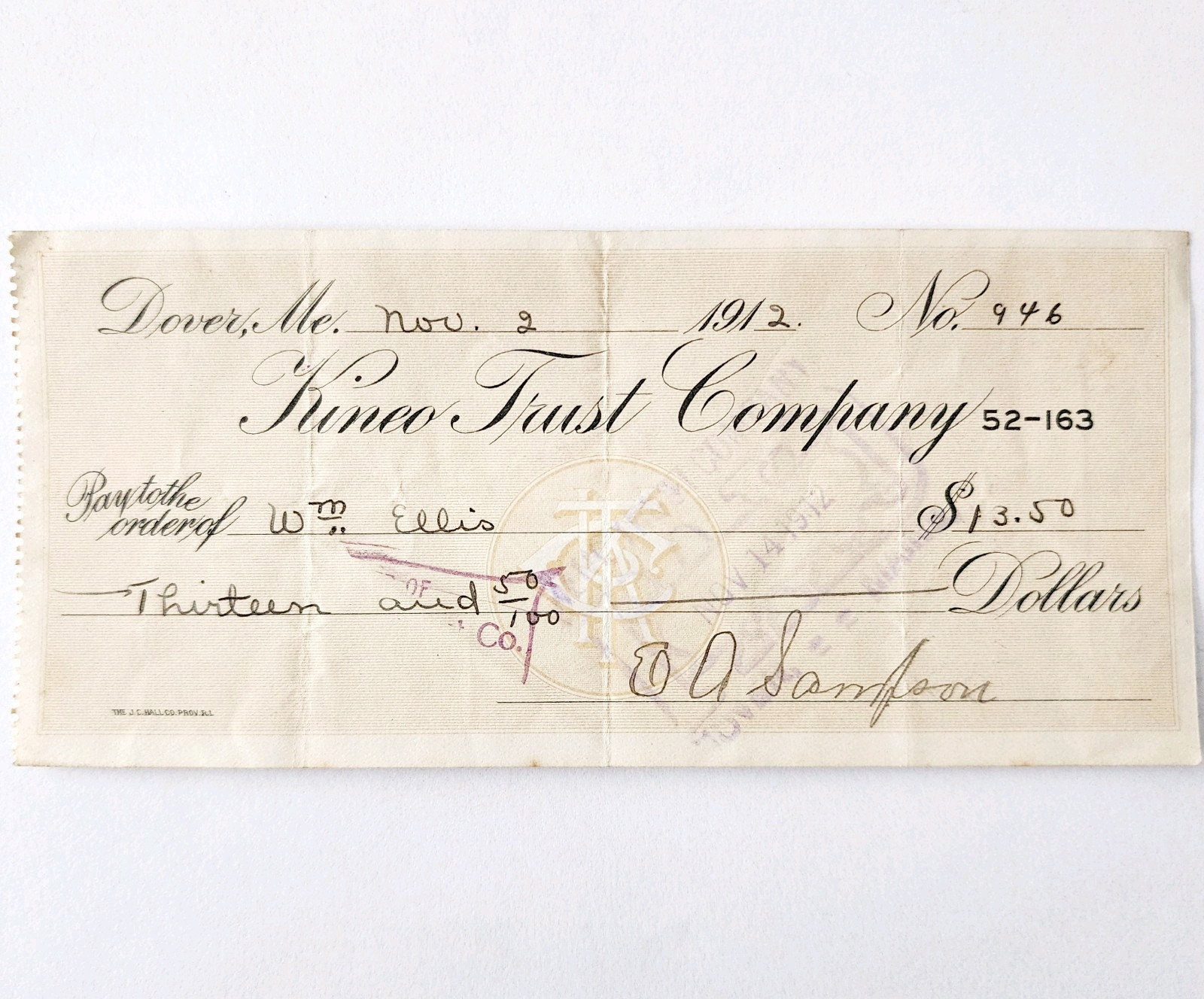 1912 Kineo Trust Company Bank Check E.A. Sampson Dover Maine Signed Antique CHX1 added to cart.