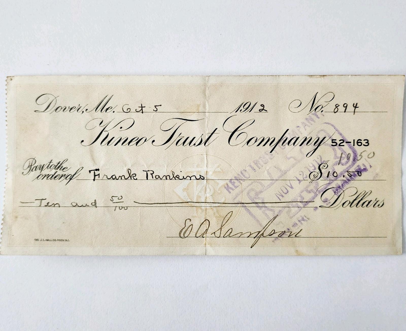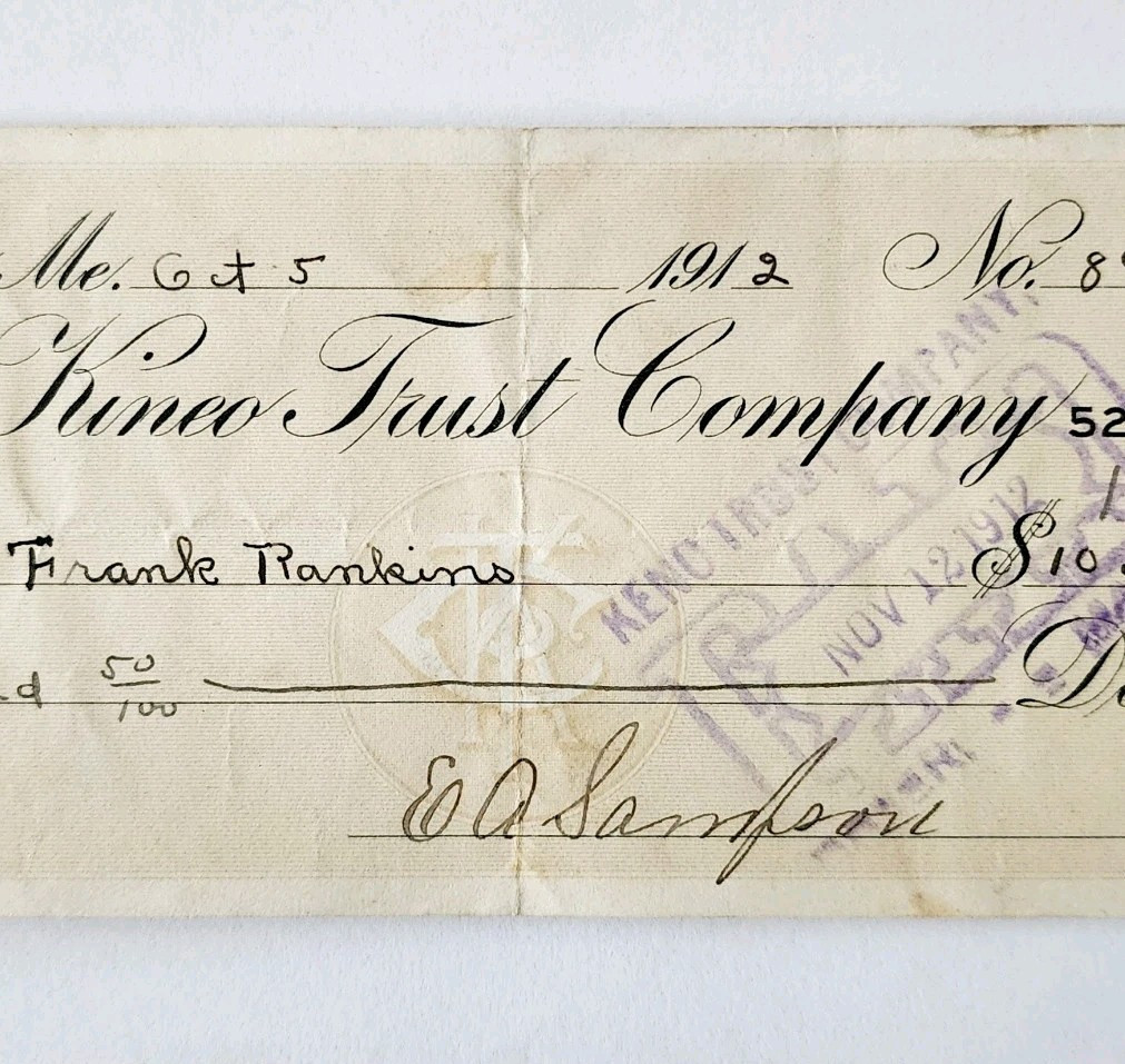 1912 Kineo Trust Company Bank Check E.A. Sampson Dover Maine Signed 894 CHX2