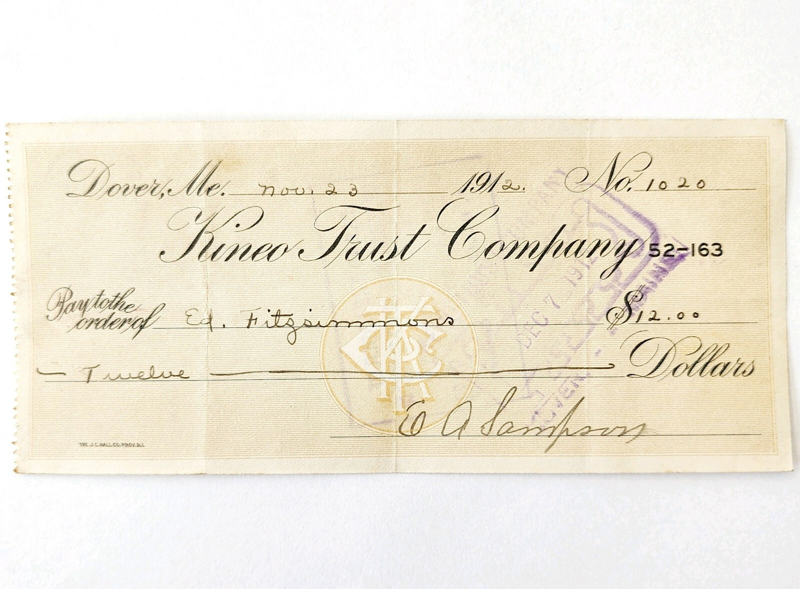 1912 Kineo Trust Company Bank Check E.A. Sampson Dover Maine Signed 1020 CHX3
