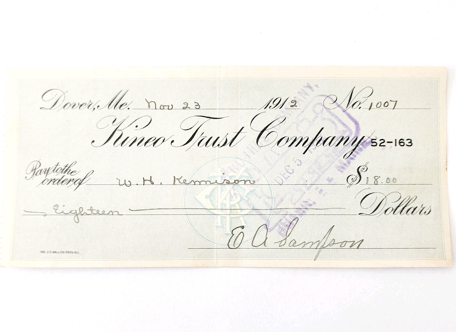 1912 Kineo Trust Company Bank Check E.A. Sampson Dover Maine Signed 1007 CHX3