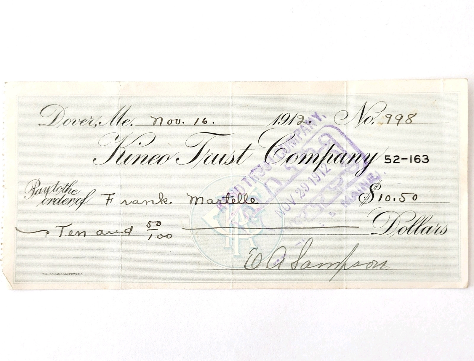 1912 Kineo Trust Company Bank Check E.A. Sampson Dover Maine Signed 998 CHX3