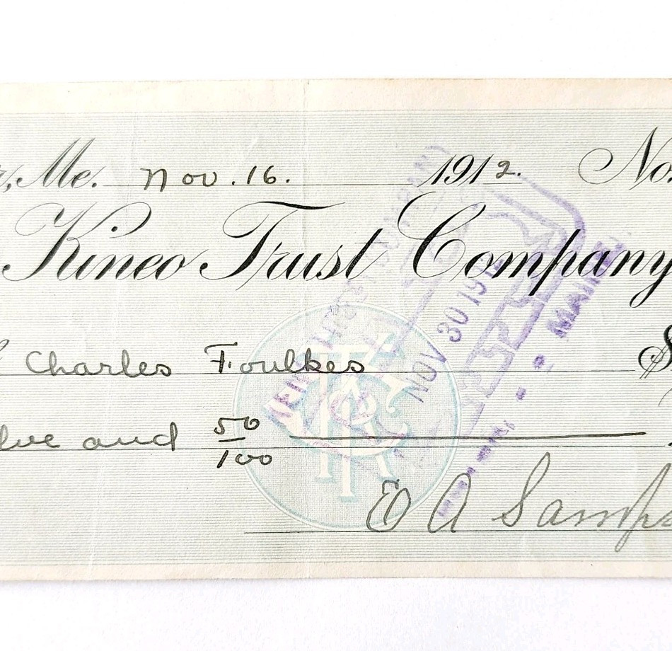 1912 Kineo Trust Company Bank Check E.A. and similar items