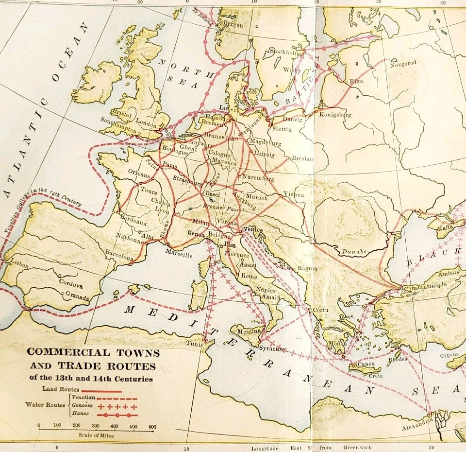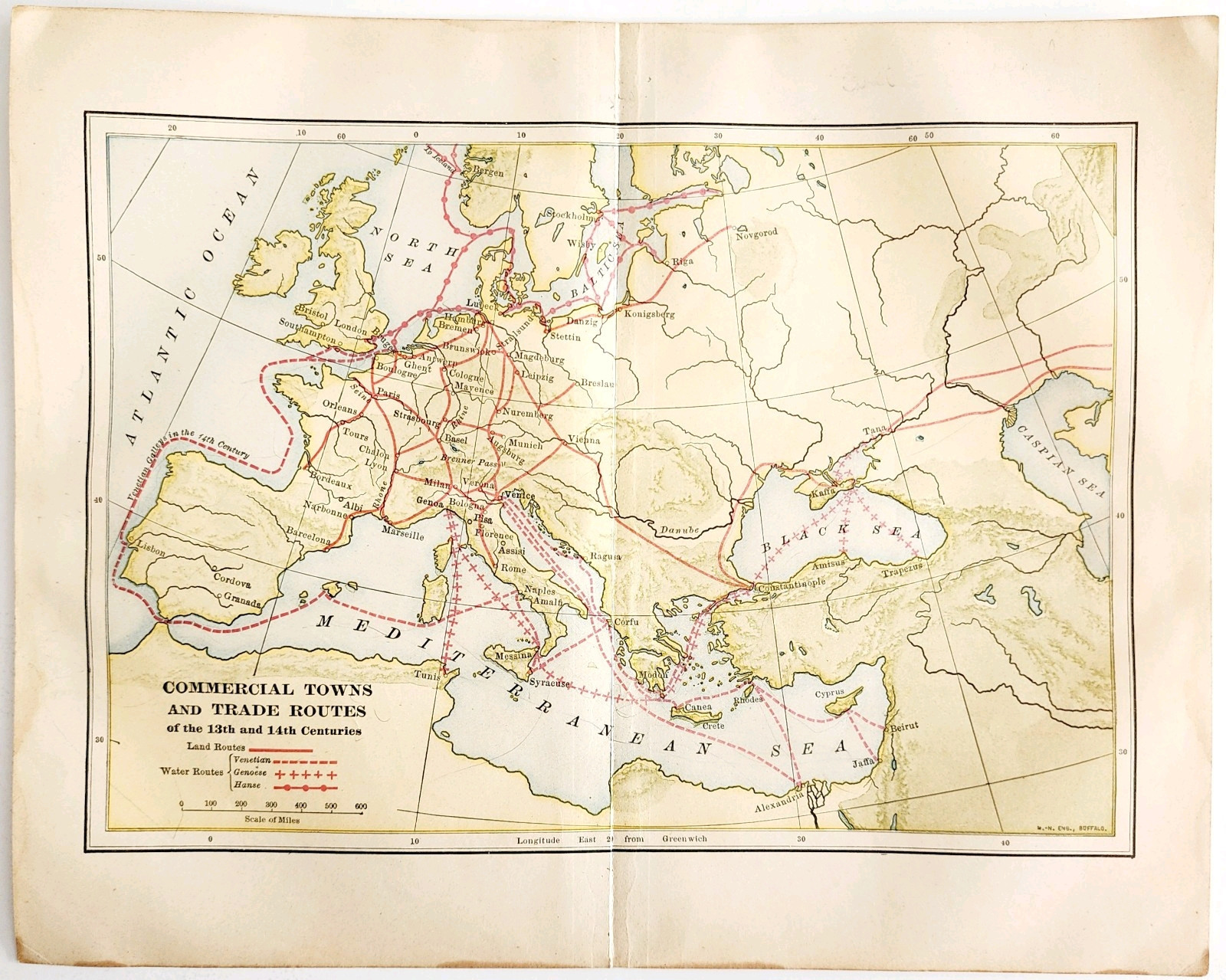 1929 Map Europe Commercial Towns Trade Routes 13th 14th Century Antique DWY11