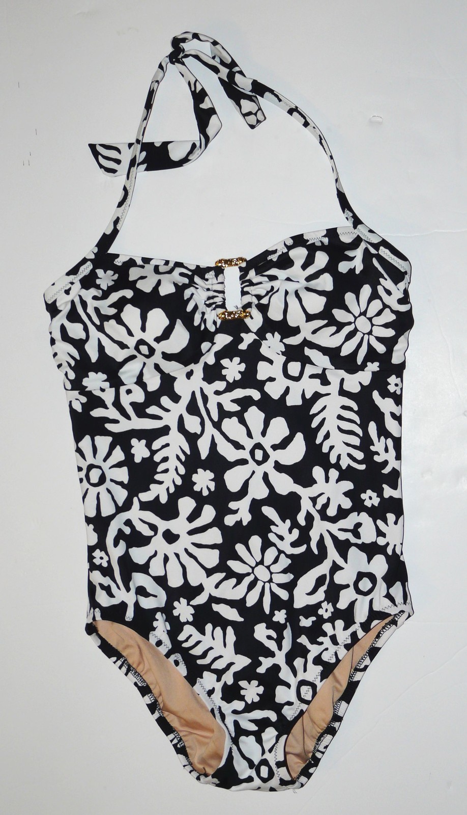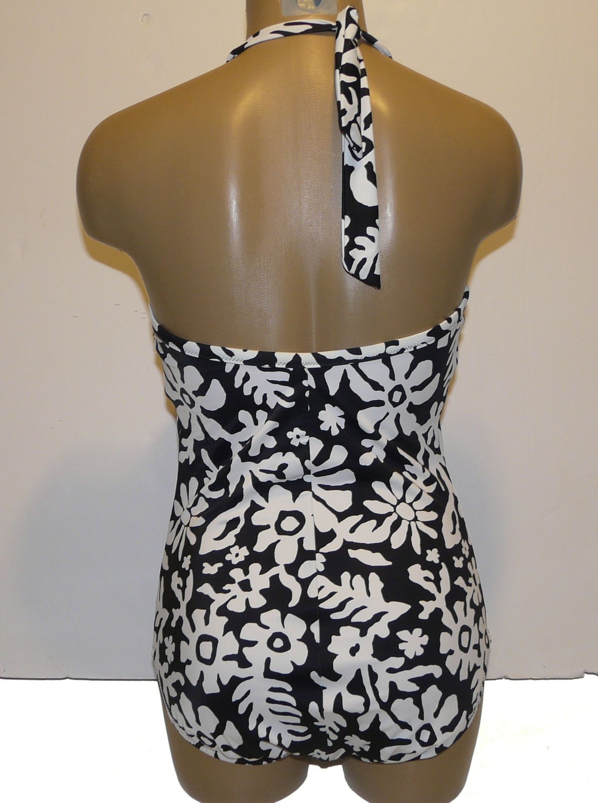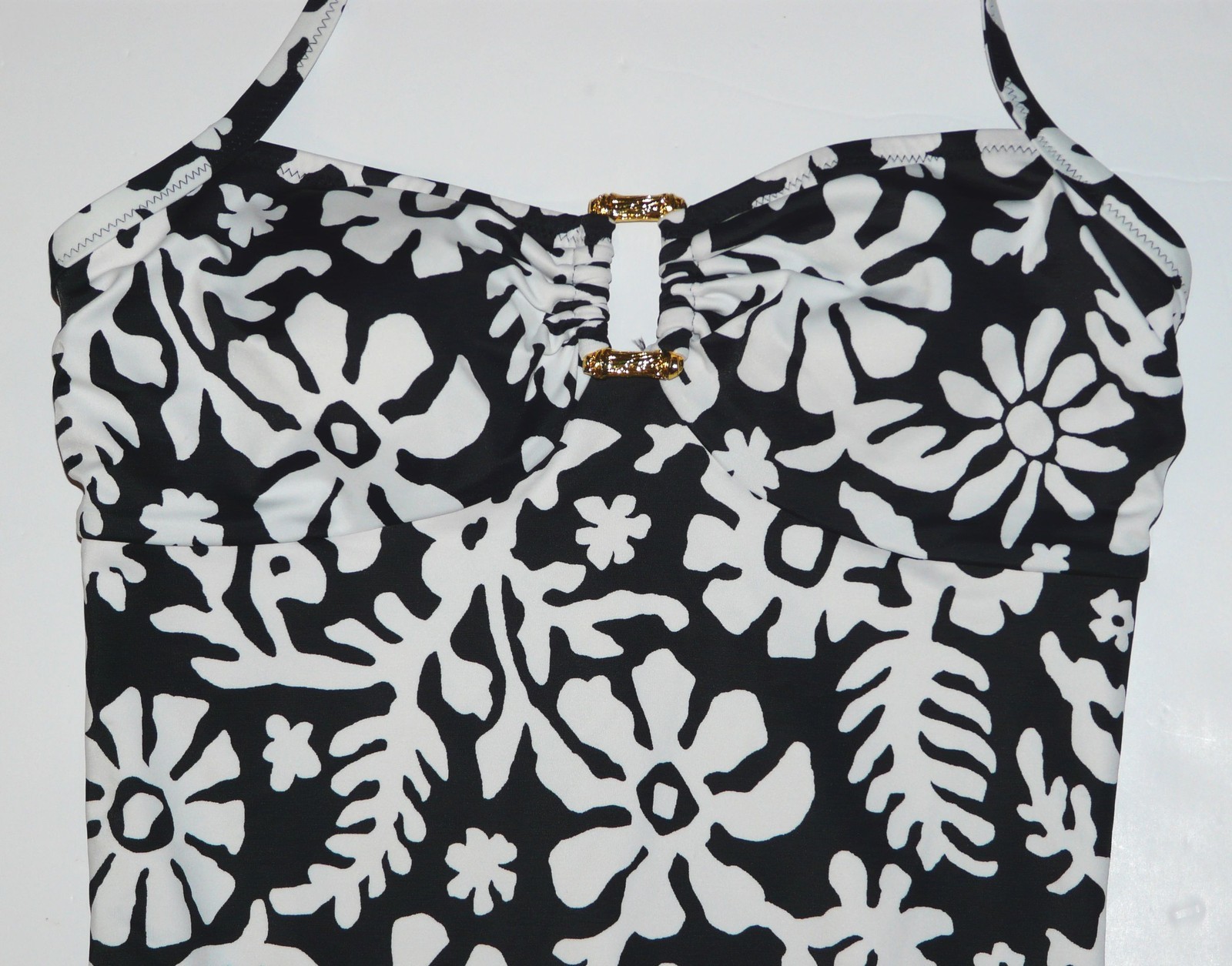 LANDS END Sz 8 Black White Floral Gold Accent One Piece Swimsuit EUC