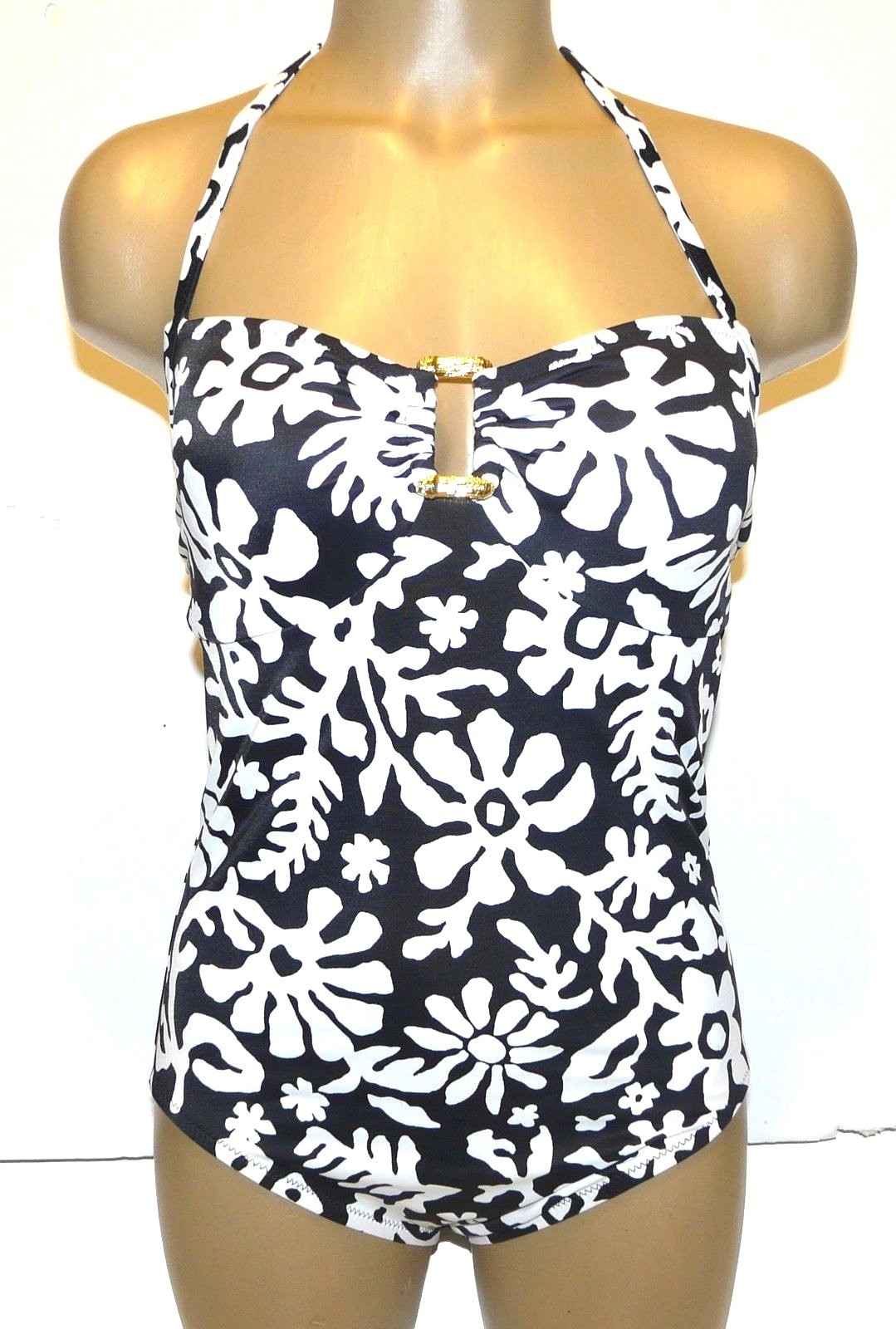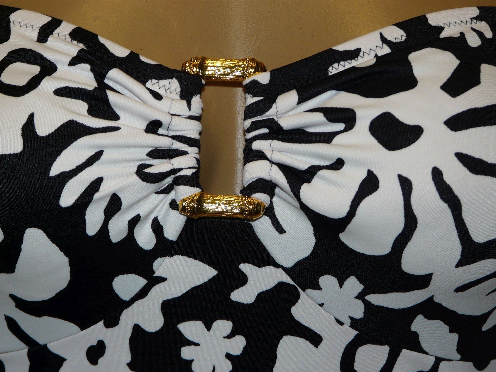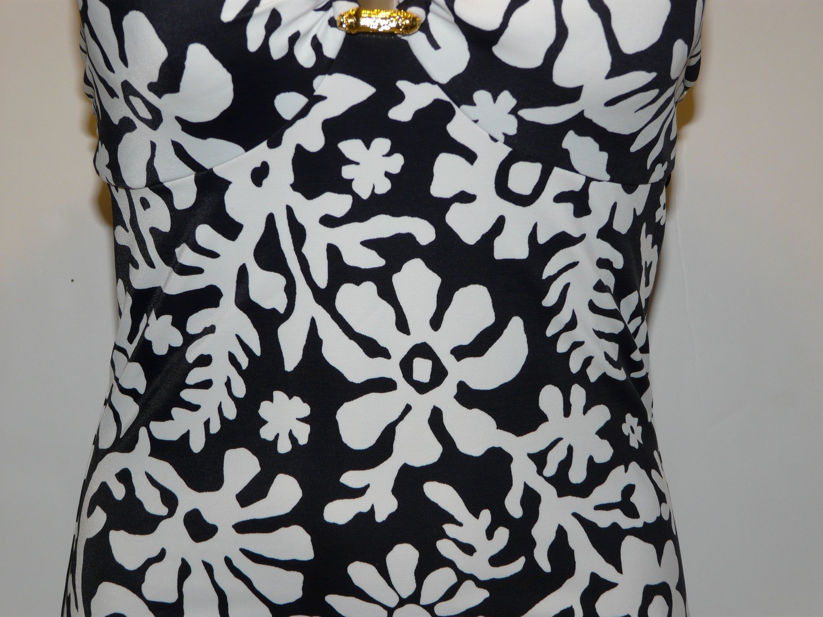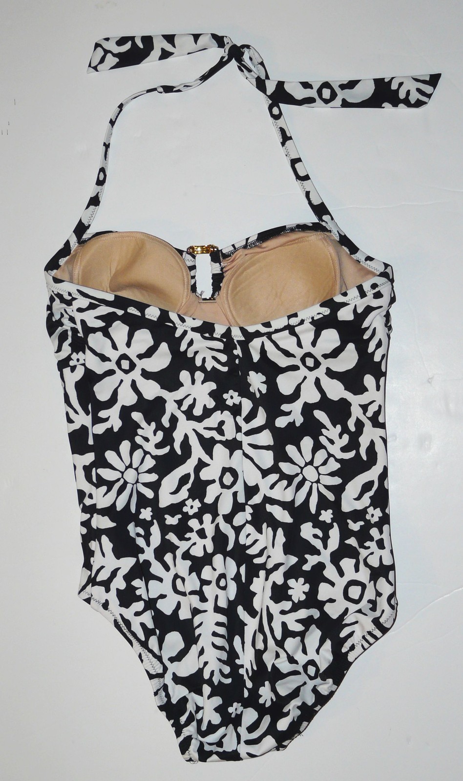 LANDS END Sz 8 Black White Floral Gold Accent One Piece Swimsuit EUC