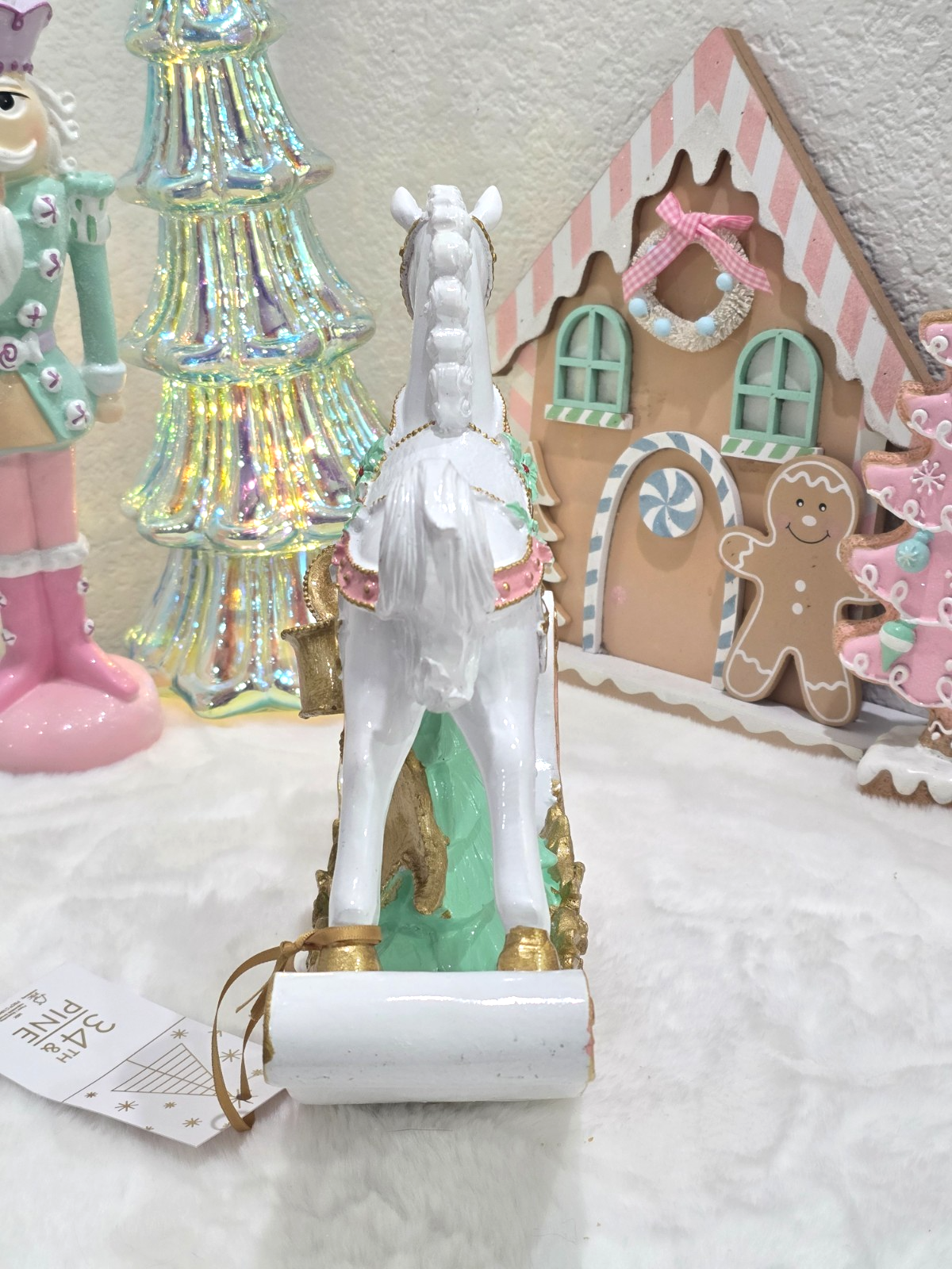 Up for sale we have this stunning pastel rocking horse figurine for your holiday tabletop decor. The horse is white, pink with gold. This piece is sooo beautiful and will look adorable anywhere you place it. It's made of resin. New