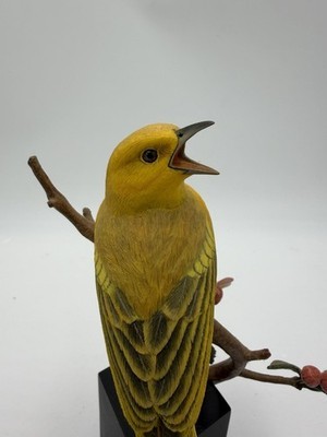 The RARE Danbury Mint SPRING SERENADE Yellow WARBLER Bird Figurine BY Jeff Rechtin is a beautifully crafted resin figurine depicting a yellow warbler bird, perfect for the spring season. Hand painted with intricate details, this collectible piece from the late 20th century is a unique addition to any room's decor. The figurine comes unboxed and features a bird theme, making it a special item for adults who appreciate bird-related sculptures and figurines. A beautiful and original piece by Danbury Mint, this figurine is a must-have for collectors of bird-themed items.