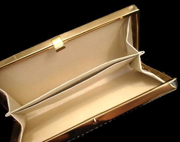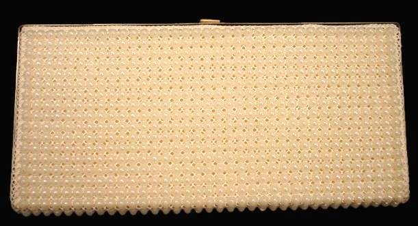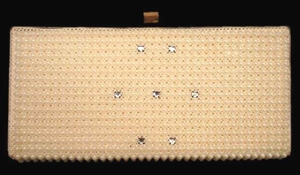 The vintage purse is a hard-sided ivory plastic pearl clutch with goldtone frame and closure and seven rhinestone accents. The lining is ivory satin with three sections and it measures 3 oe? x 8? with a 1? bottom. It is in excellent condition and would make a perfect wedding bag.