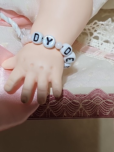 Accessories: White baby bottle, pink and white head birth bracelet stating Dy-dee.