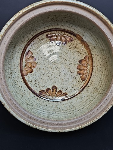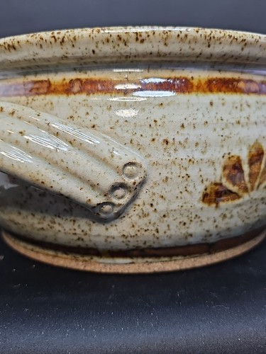 Crafted from stoneware using art pottery techniques, this covered dish was handmade. The backstamp is incised with the brand signature.
