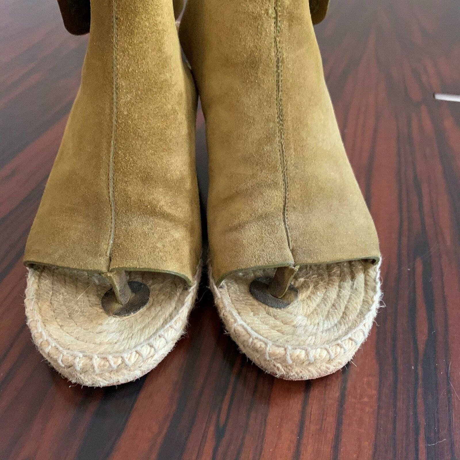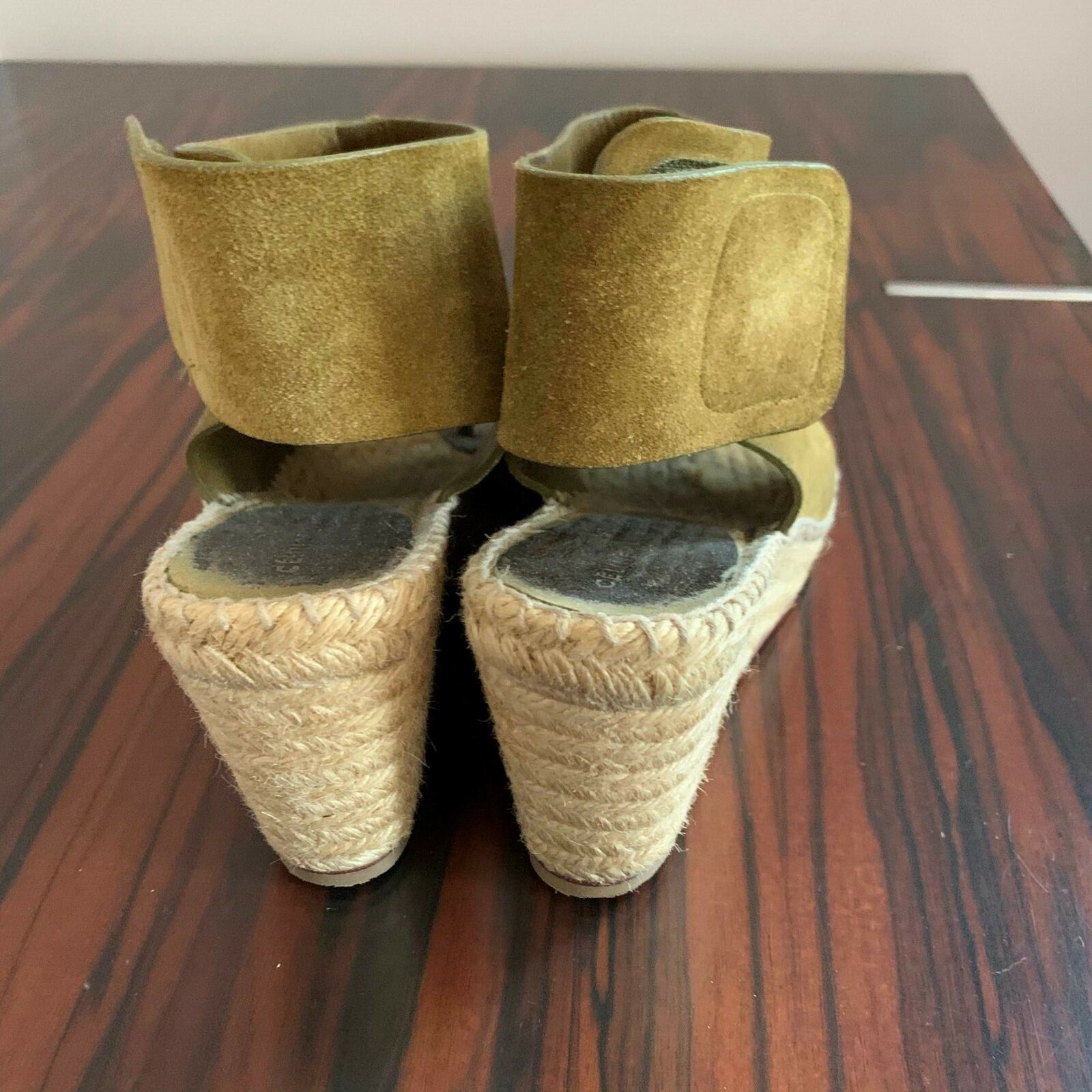 CELINE Suede Olive Green Open Toe Wedge Sandals SZ 6 Made in Spain EUC