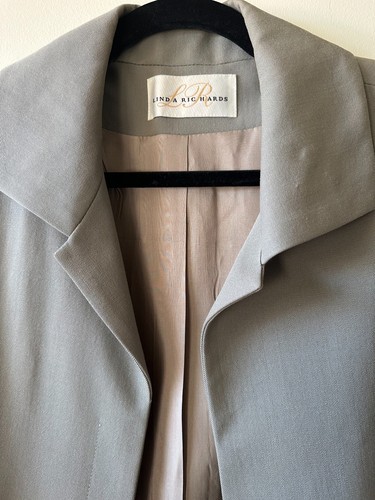 This vintage Linda Richards taupe gray 100% wool blazer is in excellent pre-owned condition with no signs of damage of any kind. It features:
