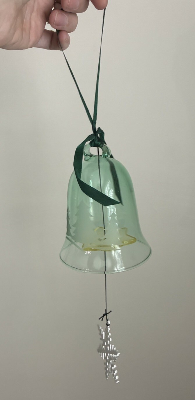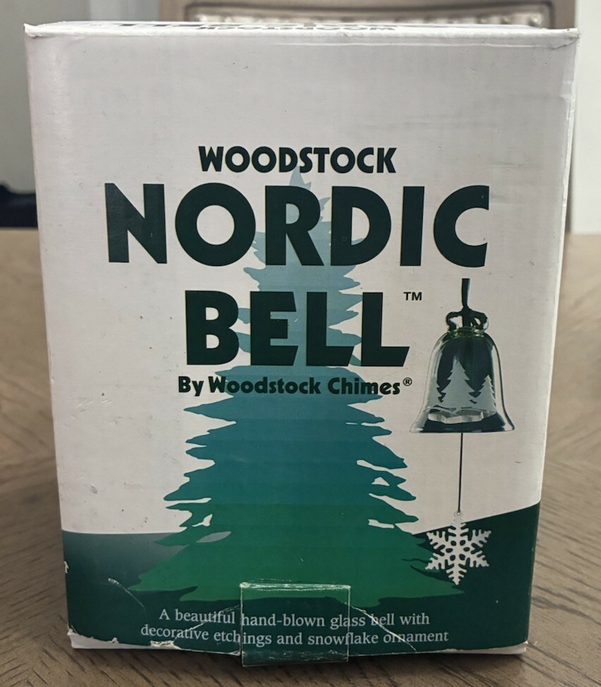 Woodstock Chimes Nordic Bell Tree Etched Green Blown Glass Evergreen Snow W/Box!. Condition is Used. Shipped with USPS Ground Advantage.