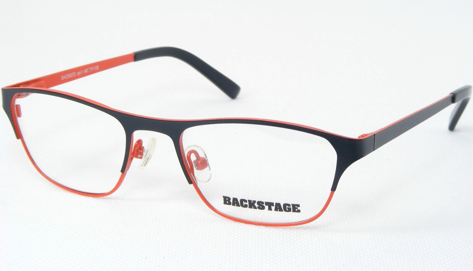 BACKSTAGE BAC90073 col. 1 BLACK /ORANGE RED EYEGLASSES GLASSES FRAME 48-17-135mm. (K1142) Actual photos of these glasses. This is exactly what you will receive. Notes: no scratches /there are reflections on the frame from photo lamps Style and comfort in everyday use. A pair of glasses is not just an accessory; it provides the first hint of an individual?s personality. The wearer must enjoy a frame and feel that it is completely consistent with his or her look and mindset. A great pair of glasses, with all its detail and complexity must above all be an extension of the individual. Returns are always FREE for any reason. If you don't like it, simply click "Item no longer needed". Item should be returned within 60 days as UNUSED in original packaging. If you have any questions please feel