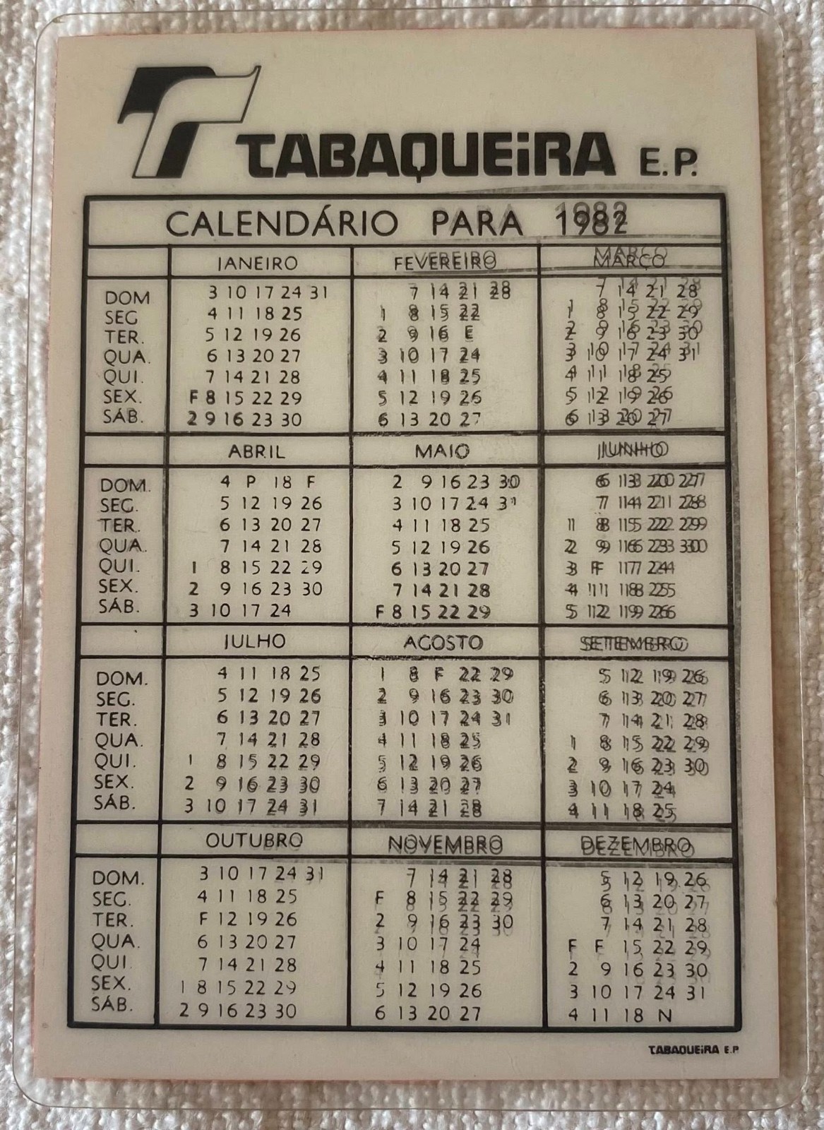 ⭕VTG card pocket calendar 1982 TOBACO SG PACK PLASTIFIED TABAQUEIRA