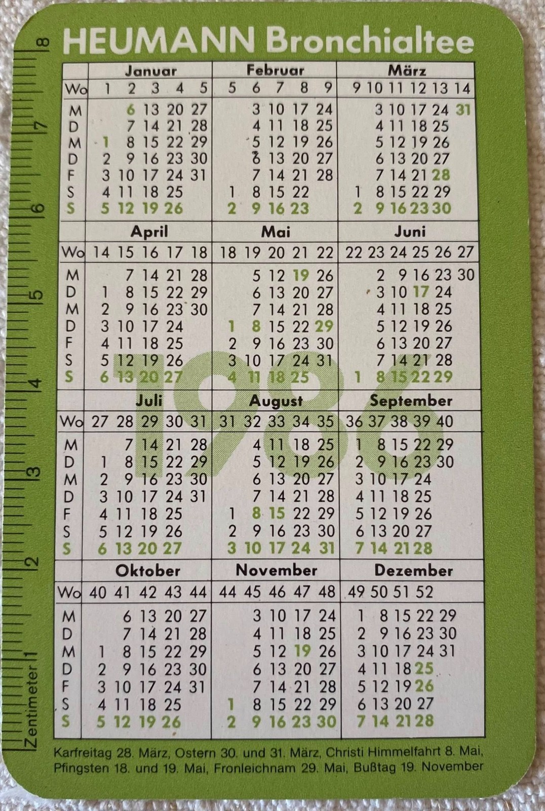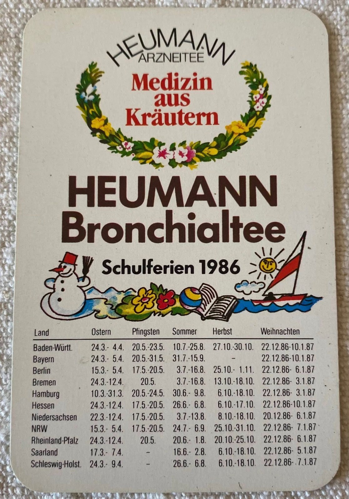 ⭕VTG, card pocket calendar 1986 HEUMANN BRONCHIALTEE advertising