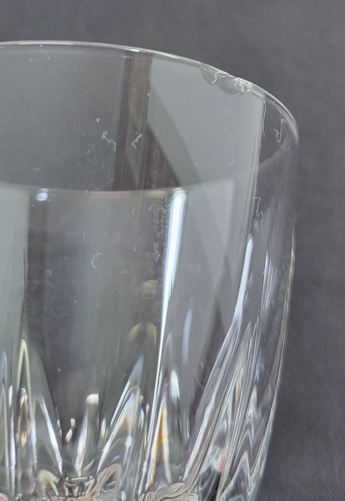 One glass has a slight edge chip on the rim, while all other glasses are in overall good, used condition with no chips or cracks.