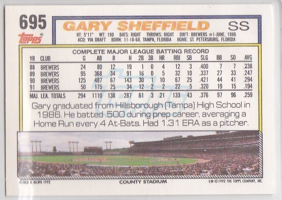 M) 1992 Topps Baseball Trading Card - Gary Sheffield #695