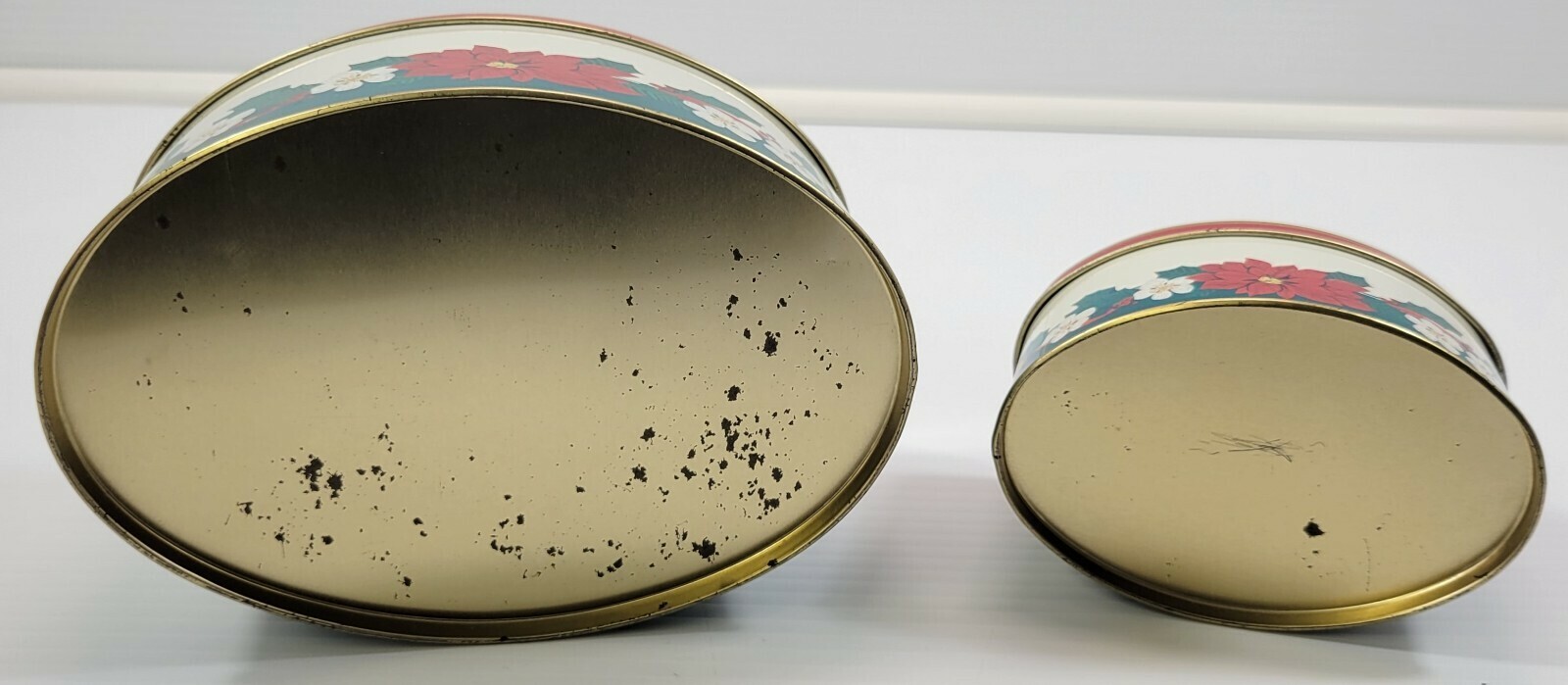 Tins are in vintage used condition with possible signs of seasonal use and storage but no major dings or dents. There is some tarnish to the metal.