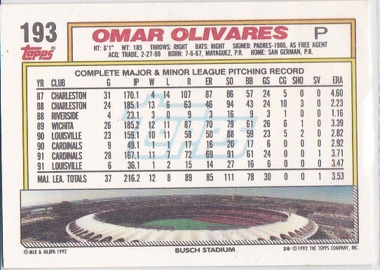 M) 1992 Topps Baseball Trading Card - Omar Olivares #193