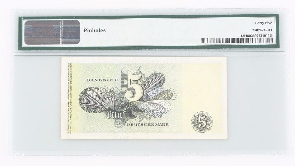 Sealed in a PMG holder with the title "Germany - Federal Republic // Pick# 13i 1948 5 Deutsche Mark - Printer: BDK // S/N 8J514504 - S/N Prefix Higher Than 7A"