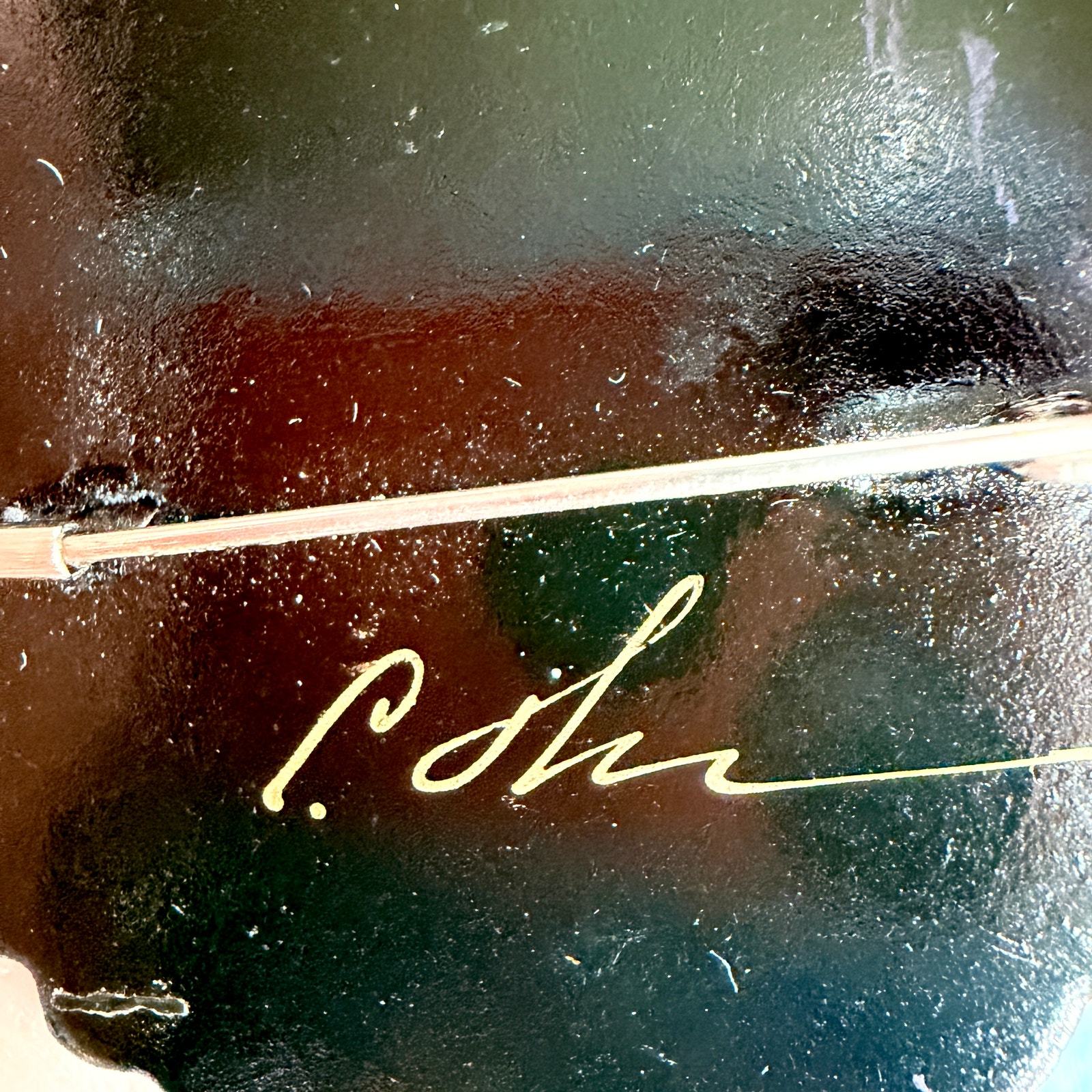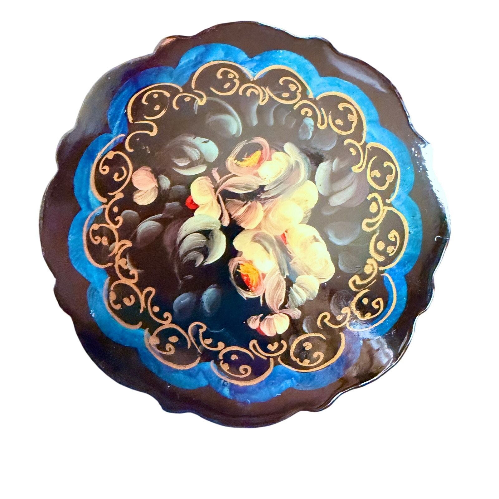 This exquisite vintage lacquer brooch captures the beauty of Russian floral folk art. Hand-painted in the Zhostovo/Fedoskino lacquer miniature style, it features richly layered brushstrokes, a luminous cobalt and black background, and intricate gold detailing. Signed by the artist on the back, this piece dates from the 1970s to early 1990s, a classic Soviet-era collectible.